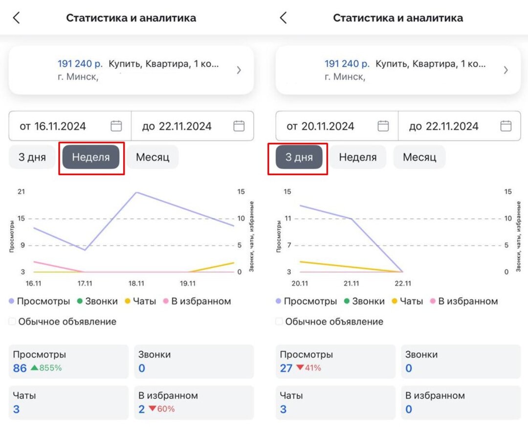 «Статистика и аналитика» — это сервис в вашем личном кабинете, который позволяет отслеживать интерес к вашему объявлению в режиме реального времени. Там показывается число просмотров, звонков и открытий чата с вами. Там также можно выбирать период, за который вы хотите посмотреть активность.