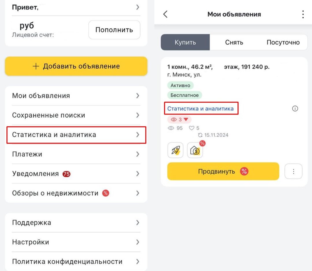 Заходим в раздел «Статистика и аналитика». В него можно попасть как из личного кабинета, так и с карточки своего объявления.