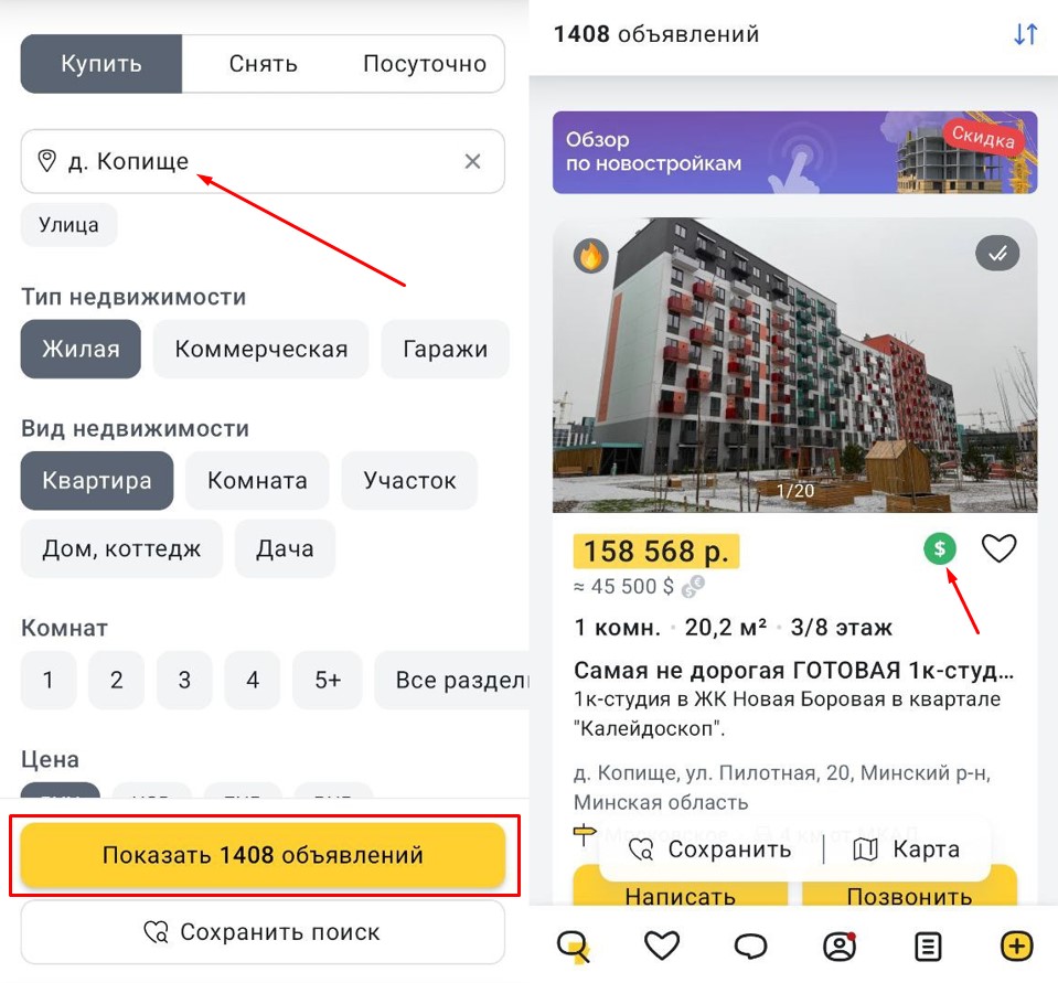 Вбиваем в фильтры в приложении Realt квартиры в Копище и включаем сортировку начиная от самой дешевой.