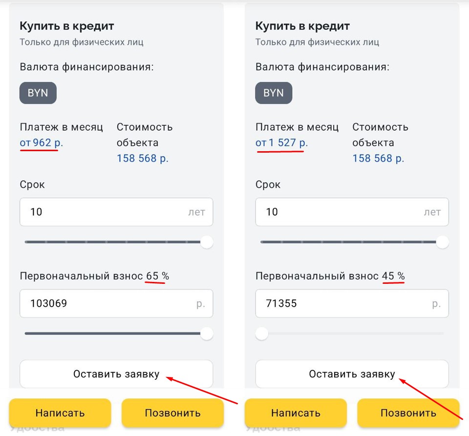 А рассчитать первый взнос и ежемесячные платежи по кредиту можно в онлайн-калькуляторе прямо в объявлении. Плюс — отправить заявку в банк.