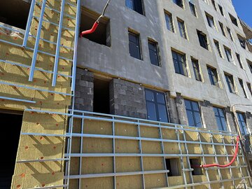 Сейчас начали устанавливать окна на первом блоке, а также приступили к устройству фасадных систем.