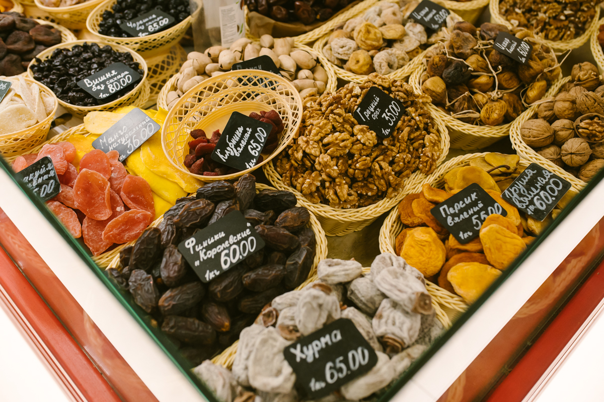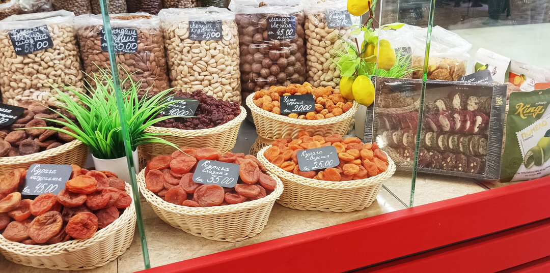 К чаю поищем сладкие сухофрукты, которые продаются в отдельном павильоне. Продавец советует разные виды изюма — от 15 до 20 BYN/кг, также в наш бюджет вписываются иранские финики (10 BYN/кг), шиповник (18 BYN/кг). Можно сделать ассорти из разных орехов и сухофруктов или выбрать готовые подарочные наборы (от 20 BYN/кг).