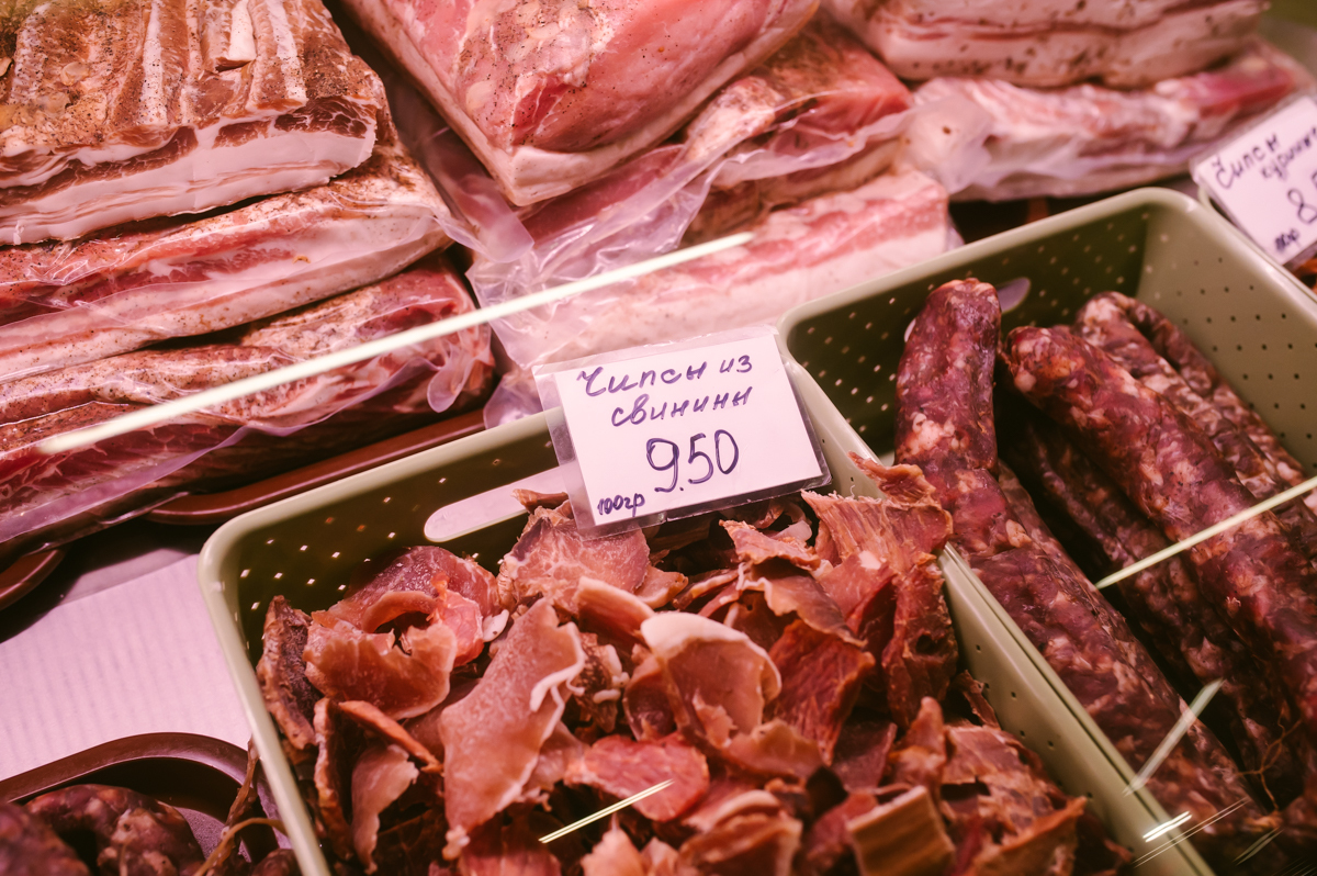 Также наше внимание привлекает нежное сало (9,9 BYN/кг), которое, кажется, можно намазать на хлеб. В качестве перекуса в дорогу можно взять мясные чипсы из курицы, свинины или индейки (9,50 BYN/100 г).