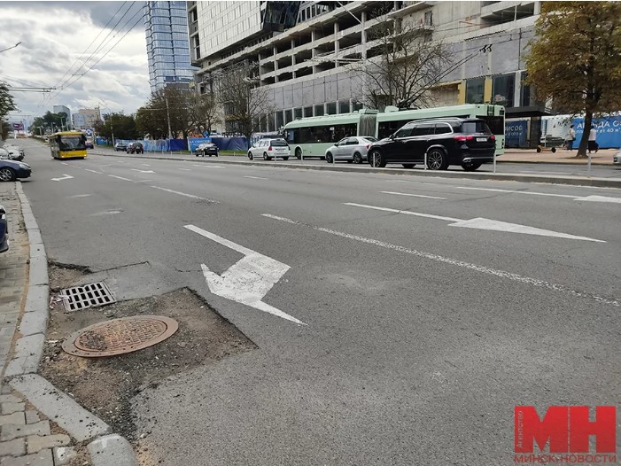 Дорожные работы ведутся как на проезжей части, так и рядом с ней. Особую осторожность и внимание водителям следует проявлять в районе дома № 40, где оборудован регулируемый пешеходный переход. Дорога здесь, если двигаться со стороны ул. Романовской Слободы, смещается вправо, что несколько затрудняет движение транспорта. Остановочный пункт «Мясникова» перенесен немного вперед. В направлении площади Ф. Богушевича проход для пешеходов временно закрыт.