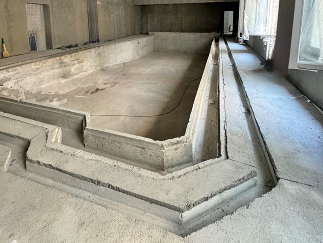 Кстати, поликлиника с бассейном. Скоро тут приступят к гидроизоляции, затем последует облицовка плиткой. В поликлинике выполнена черновая отделка, началась чистовая. Большая готовность у третьего этажа: в коридорах лежит плитка, покрашены стены, укладывается линолеум в помещениях.