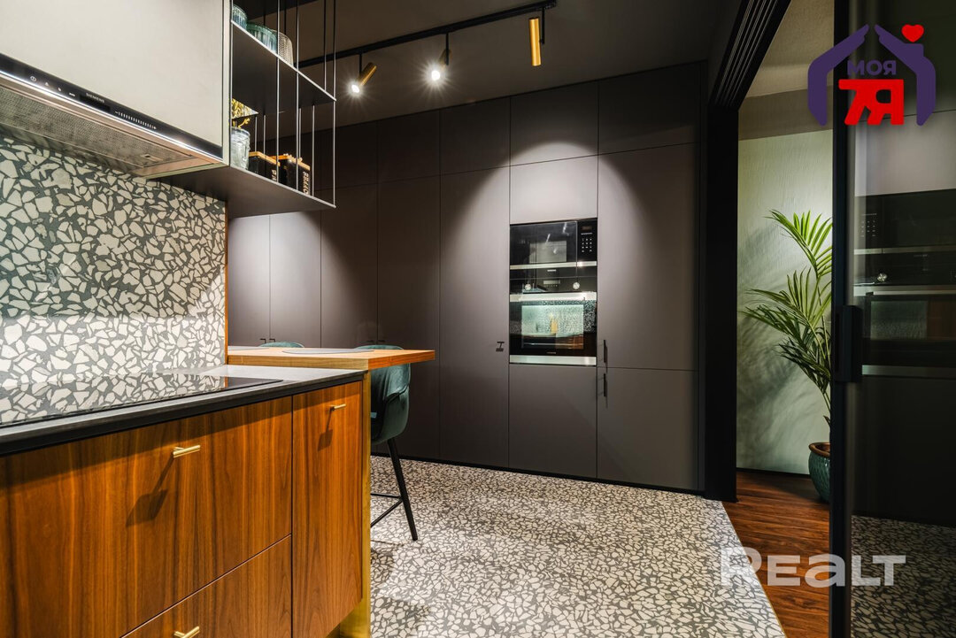 В квартире сделан хороший ремонт. Кухня обставлена встроенной техникой от бренда Siemens. Гарнитур расположен с двух сторон и сливается с дверью и шкафами в коридоре. На полу лежат паркетная доска из американского ореха и итальянская плитка. Стены облицованы из натурального шпона.