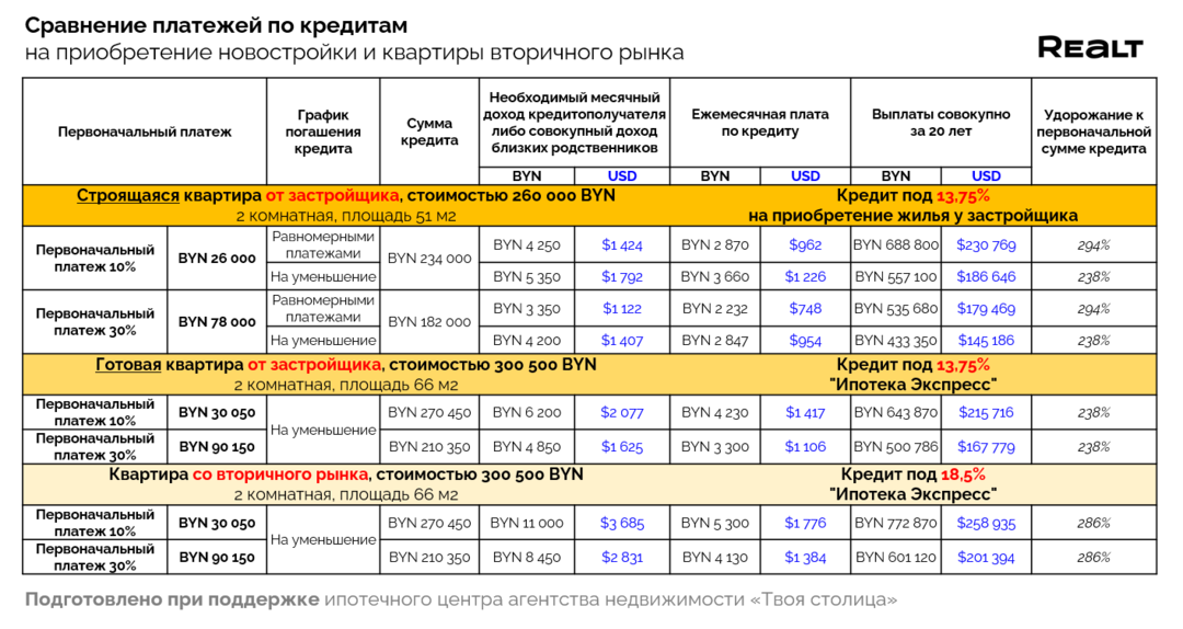 46969Вы наверняка уже читали про снижение ставок по кредитам на новостройки от Беларусбанка и знаете, что у вас есть только месяц чтобы принять решение, что покупать — новостройку или вторичку. Чтобы Вам помочь, мы сравнили на конкретных примерах варианты покупки в кредит по ключевым показателям: ежемесячные платежи, общая переплата и коэффициент удорожания.