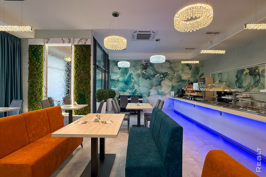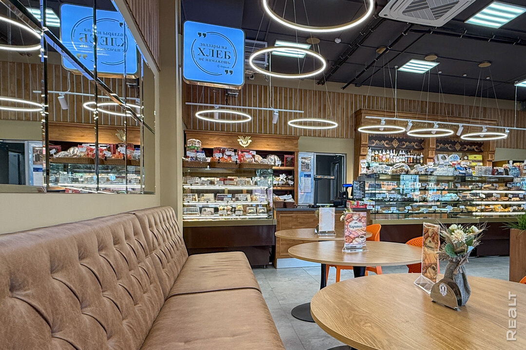 Отправляемся в «Каравай» — помещение довольно большое и светлое. Посетители здесь постоянно есть. Можно взять кофе и еду с собой или перекусить на месте. Есть столы со стульями и диваны. Ассортимент и цены — стандартные для «Каравая». Капучино продается за 3 рубля 60 коппек, американо обойдется в 2 рубля 68 копеек, чай стоит 5 рублей. Самое дешевое пирожное — трубочка с белковым кремом — рубль 21 копейка. Корзиночка стоит около 2,5 рубля. Практически любой десерт можно купить до 3 рублей. Продаются пироги на развес, чебуреки, пирожки и беляши.