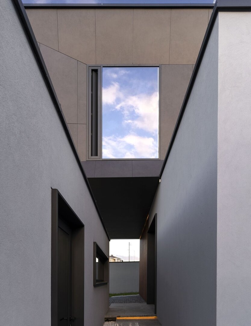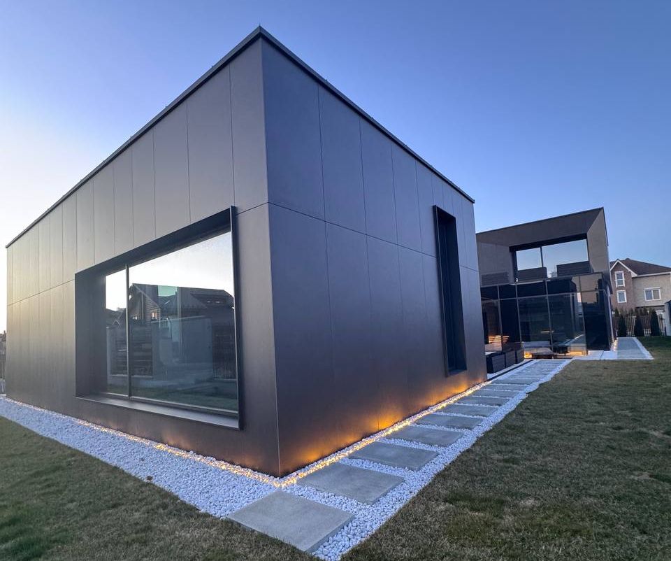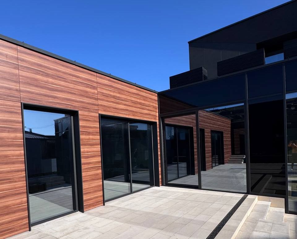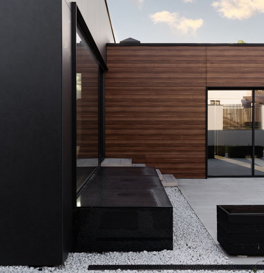 В зоне патио, внутреннего дворика для уединенного отдыха, эта материальная симфония продолжается. Здесь использованы HPL-панели, ламинированный шпон под американский орех. Эстетику фасада поддерживают детали — оконные проемы обрамлены металлическими цельносварными откосами и отливами, окрашенными порошковой краской. Трубы водосточной системы спрятаны под фасадом и не создают визуального шума.
