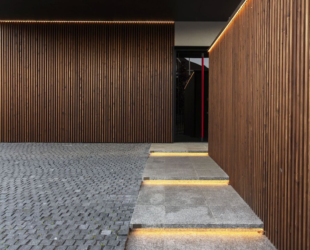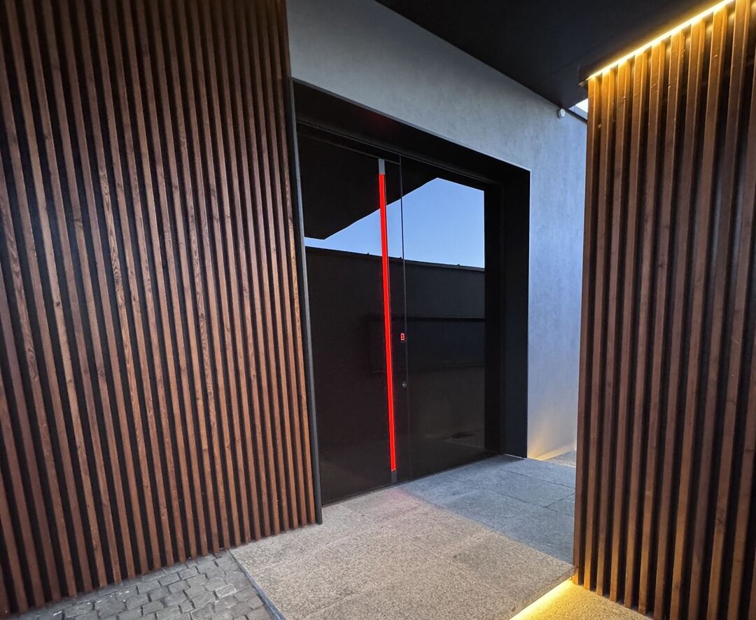Внимания заслуживает входная группа. Трехметровая стеклянная дверь в профиле Schüco со стильной вертикальной красной полоской подсветки — это не просто вход, а высокотехнологичный продукт и эффектный арт-объект. Дверь оснащена тонированным черным стеклом с керамическим напылением, которое обеспечивает приватность от взоров с улицы, оставаясь прозрачной изнутри. Весит она килограммов 300, наверное, но открывается легко — толкни пальцем створку и дверь бесшумно и плавно откроется — благодаря специальным роликам пивот-системы. Это не просто дорого — это по-настоящему круто и запоминается.