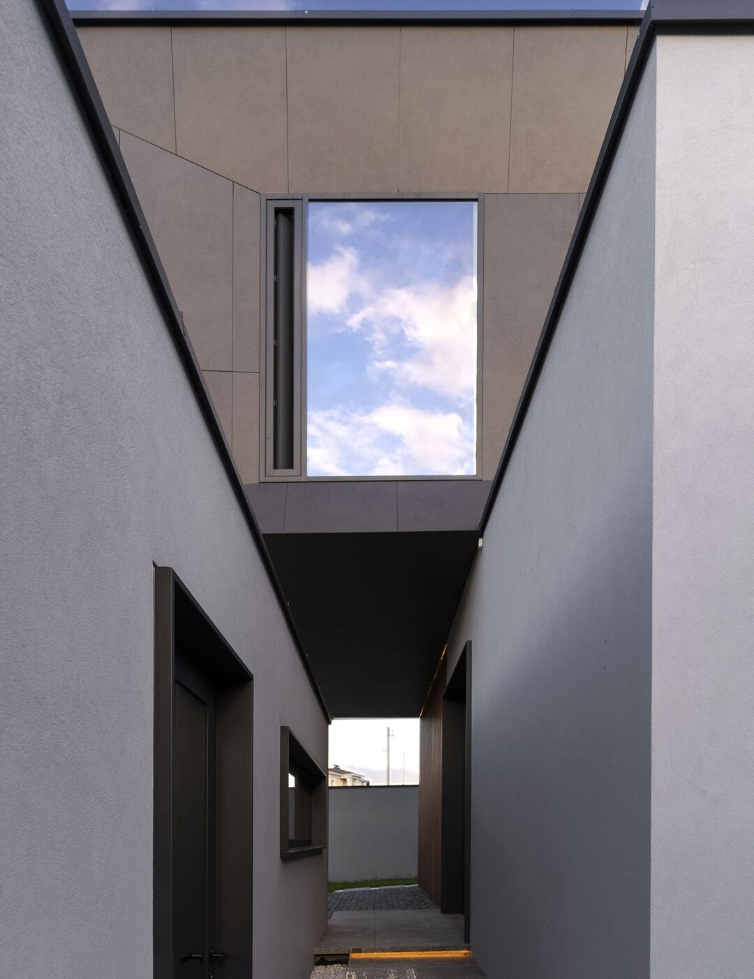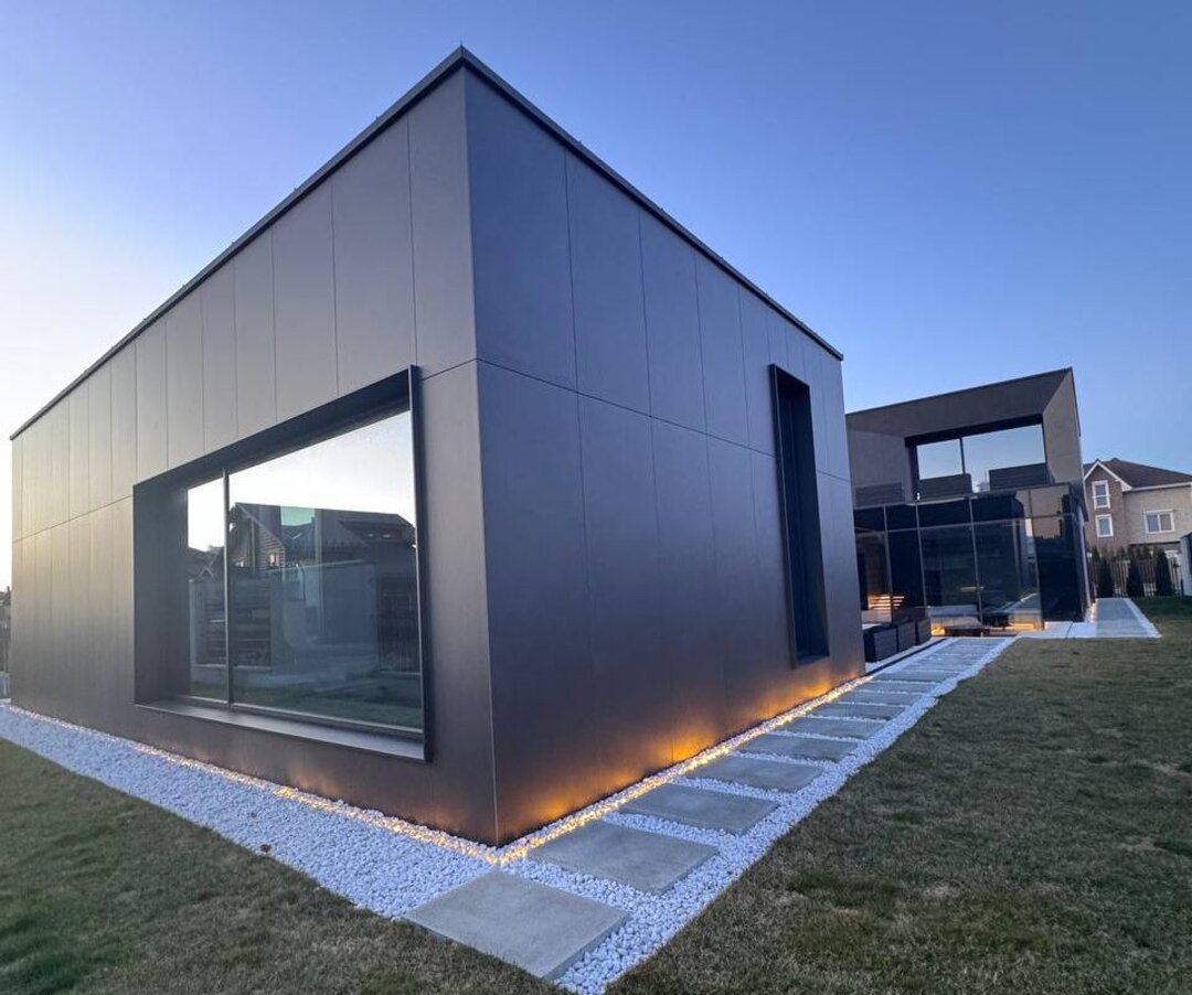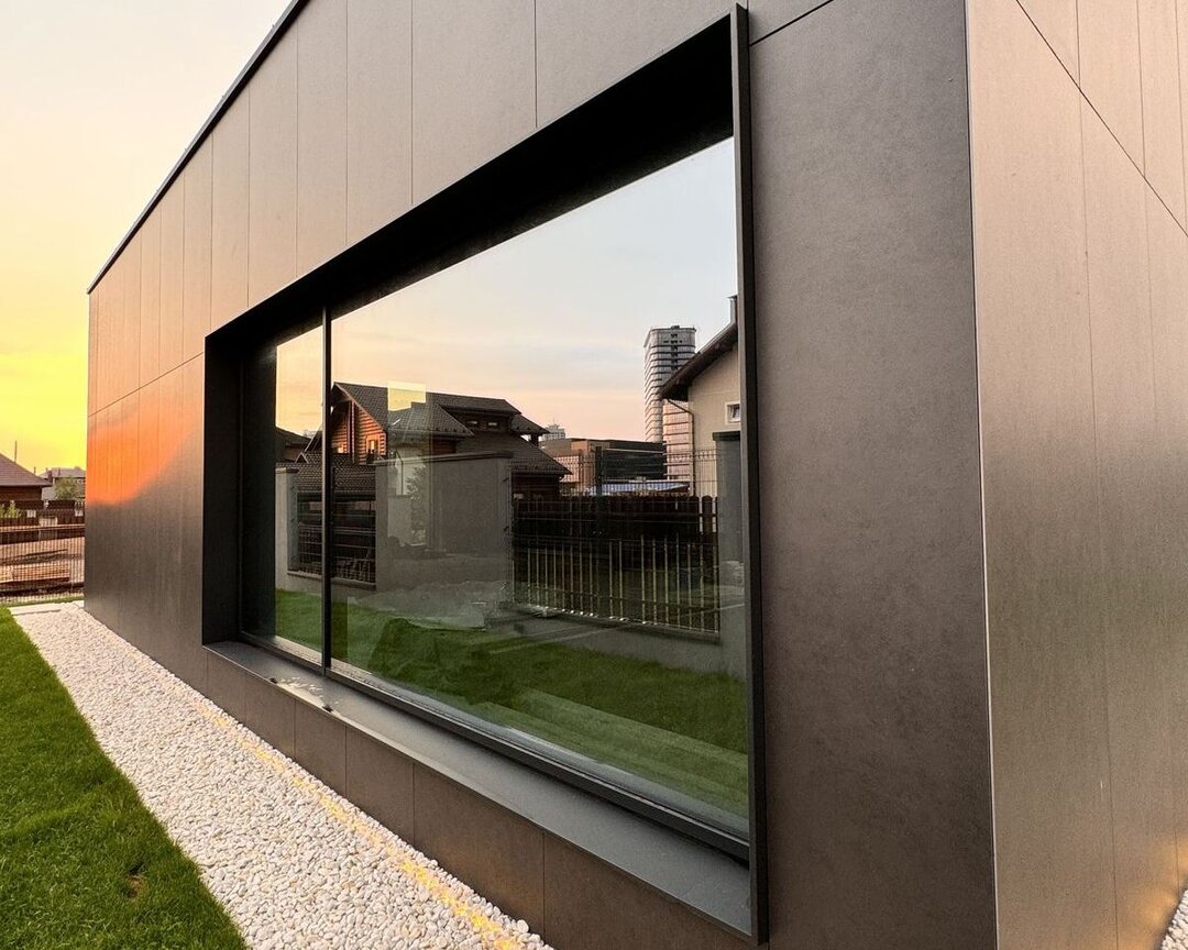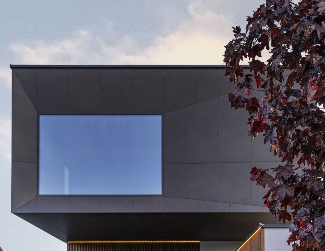 Доминирующую роль играет фасадный керамогранит Laminam. Его гигантские форматы (1×3 метра) и минимальная толщина позволяют создавать практически бесшовные поверхности. Темный матовый цвет и микротекстура материала придают фасаду ощущение цельного, выточенного из единого монолита камня.
