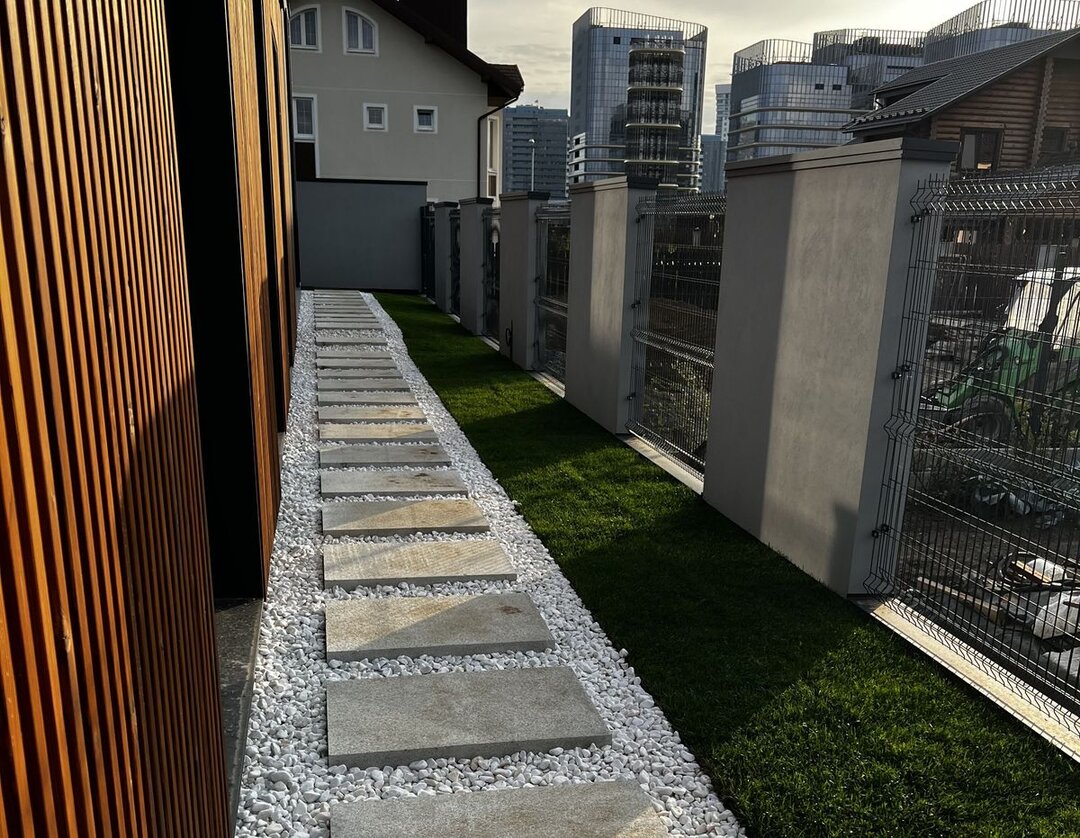 Ландшафтный дизайн здесь задуман не как статичная картинка, а как живое пространство, дающее новому владельцу полную свободу творчества. Участок подготовлен к жизни: уложен рулонный газон и работает система автополива.