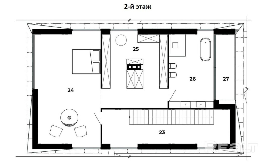 Вся площадь второго этажа отдана под мастер-спальню. Это просторное, залитое светом помещение с панорамными окнами на три стороны и местом для подвесного камина. Из спальни попадаем в светлую гардеробную, где предусмотрена техническая возможность установки современного пневмолифта.