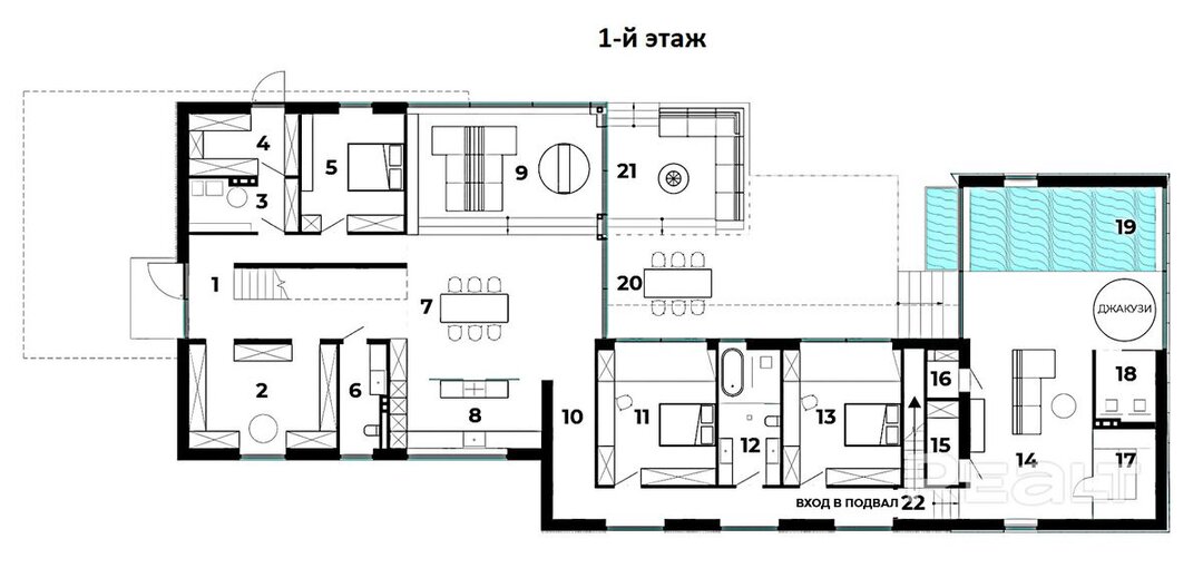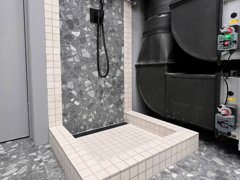 Здесь обнаруживаем еще одну приточно-вытяжную установку. Она специализированная, с функцией осушения воздуха. Работает независимо от общей вентиляции дома, что позволяет поддерживать оптимальный уровень влажности именно в зоне с бассейном. Благодаря этой системе нет конденсата на окнах, стенах и других поверхностях, а в подвале под бассейном совершенно нет «подвального» запаха и сырости.