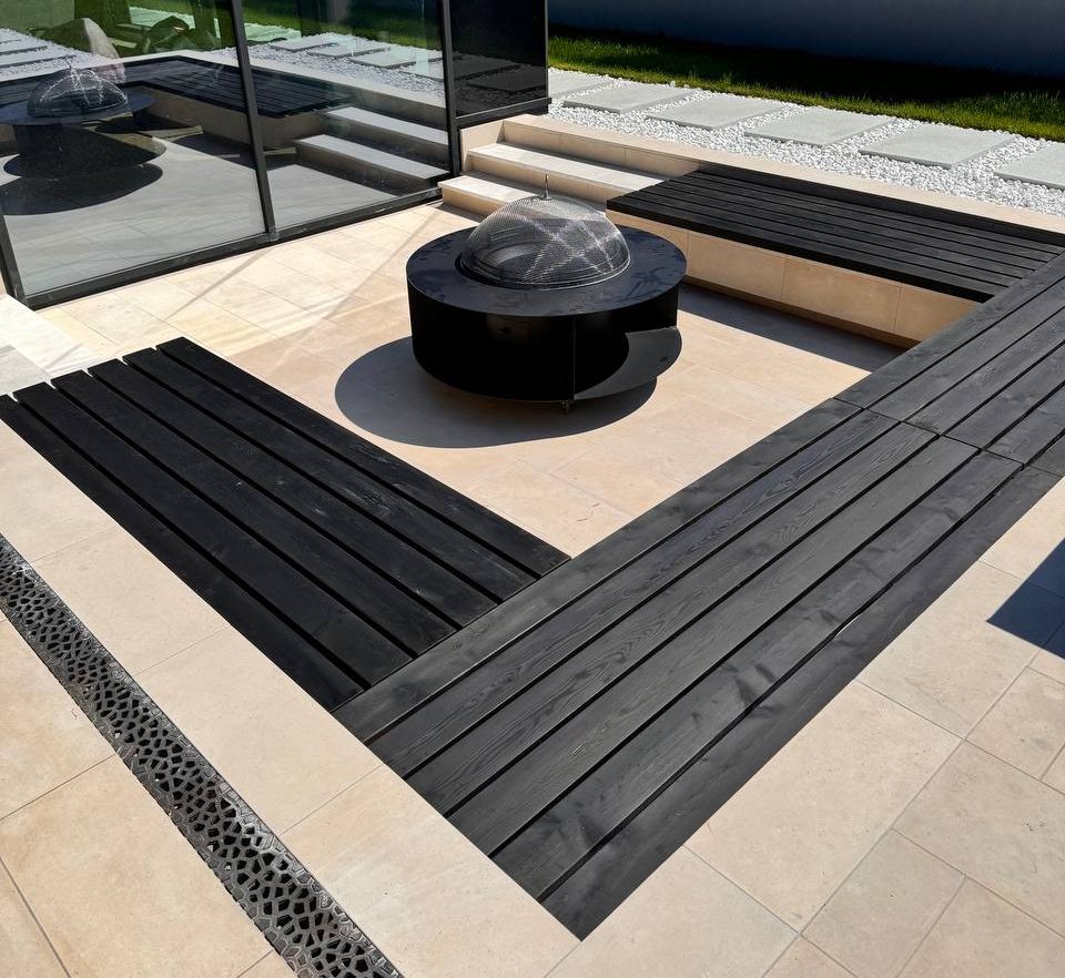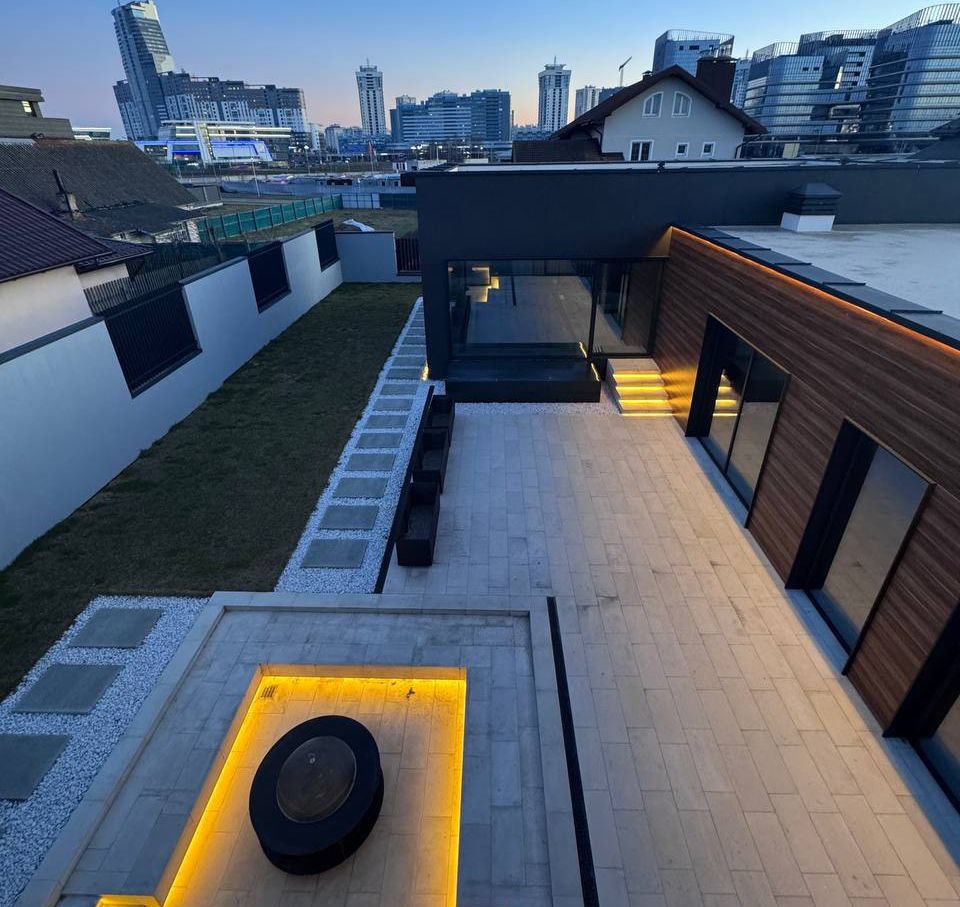 Особое внимание уделено патио — внутреннему дворику. Его мощение выполнено из натурального доломита, но здесь важно не название камня, а тактильное ощущение, которое он дарит.
