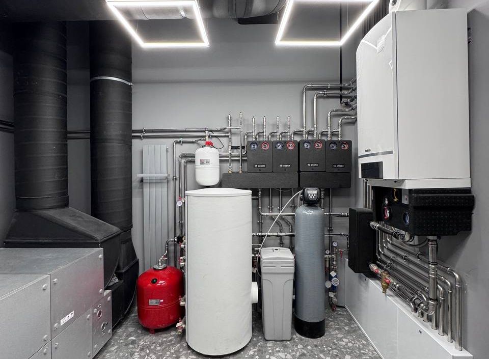 Отопление построено на системе зональных теплых полов с погодозависимой автоматикой. Спроектирована и смонтирована она профессионально: 27 независимых контуров проложены трубами швейцарской компании Compipe. Каждый контур оснащен сервоприводом, что позволяет программировать индивидуальный температурный режим для каждой комнаты (например, +19°C ночью для лучшего сна и +22°C утром для комфорта).