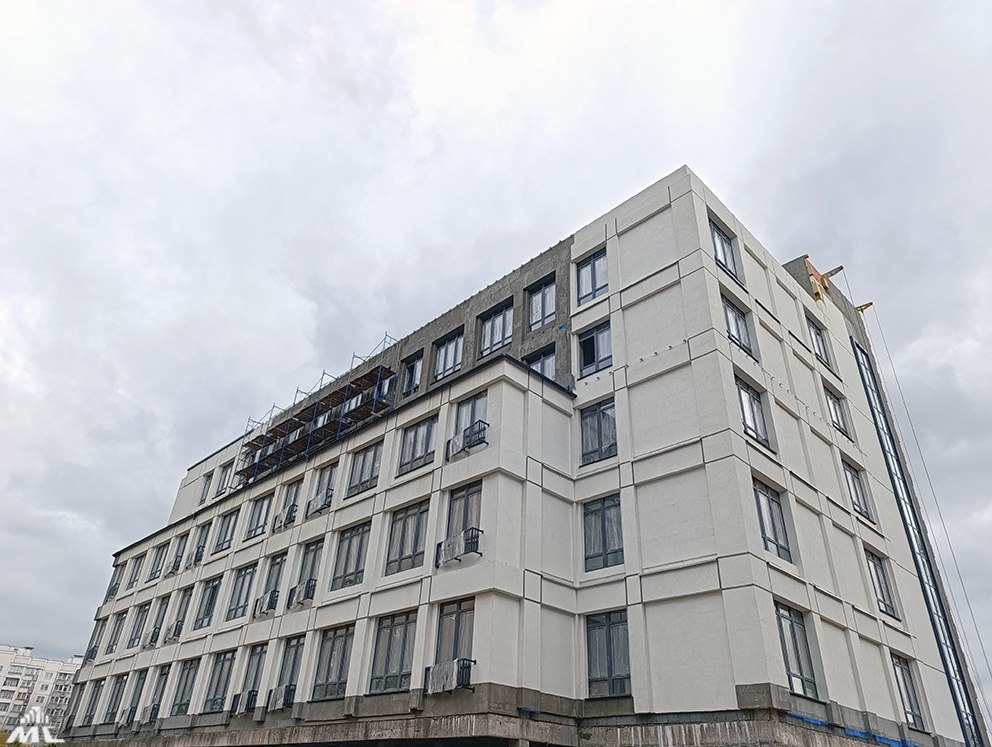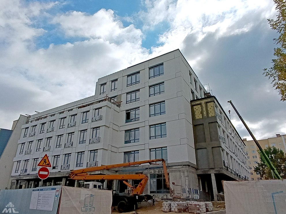 — Доутепляются отдельные участки, наносится защитная декоративная штукатурка. Через неделю планируем приступить к покраске, — говорят строители. — Уже практически готова кровля — сейчас работы ведутся на участках, где она будет эксплуатируемой. На лестничных маршах устанавливаются витражные системы, ведется облицовка бессером крылец.