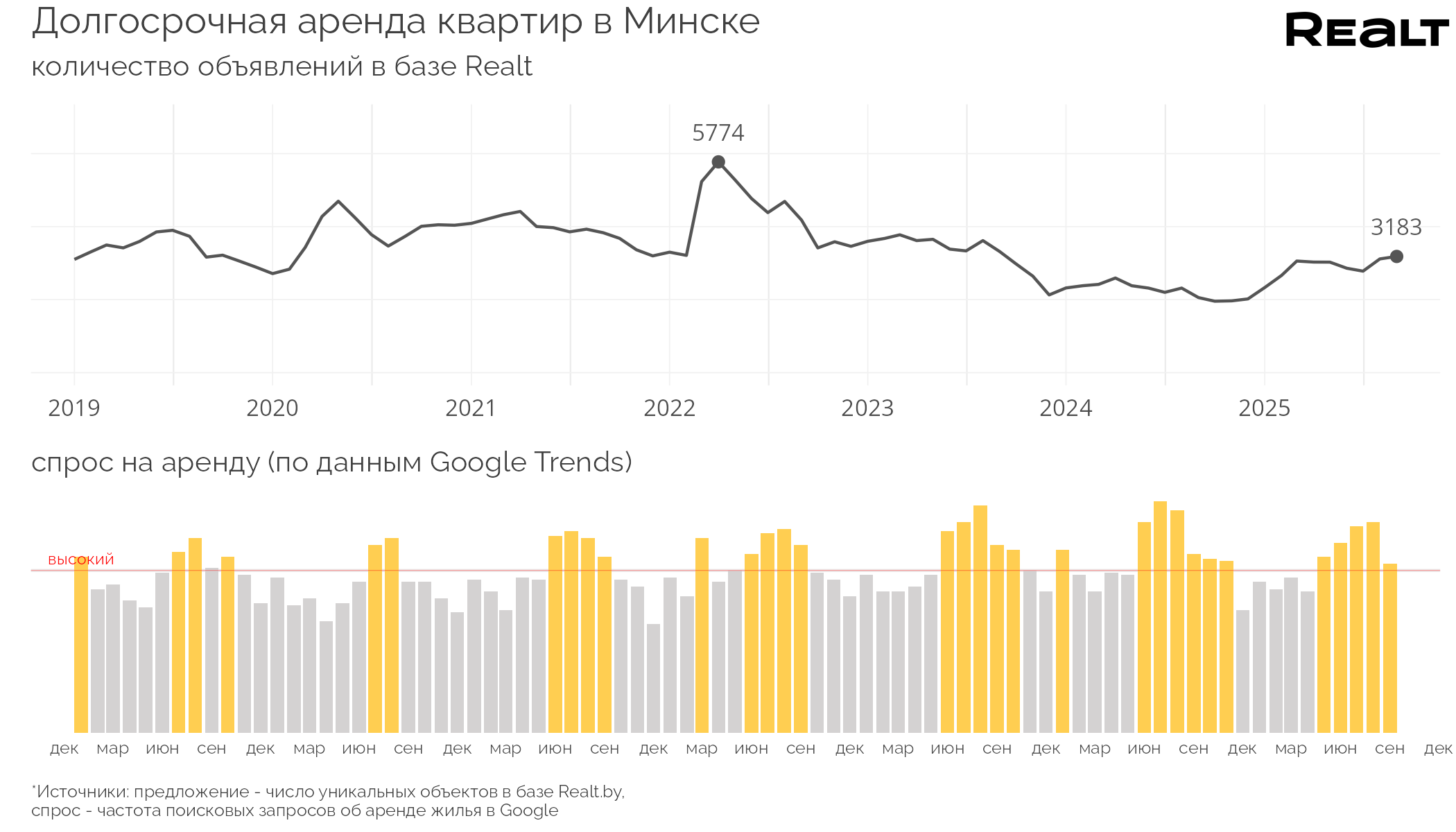 8955Спрос на долгосрочную аренду квартир в Минске после начала учебного сезона уменьшился, но сохранил стабильно высокие позиции. Стоимость за месяц осталась без изменений, но в целом за год ее рост впечатляет. На какие стоимости сегодня ориентироваться арендаторам и собственникам квартир в зависимости от количества комнат и локации города — далее в материале.