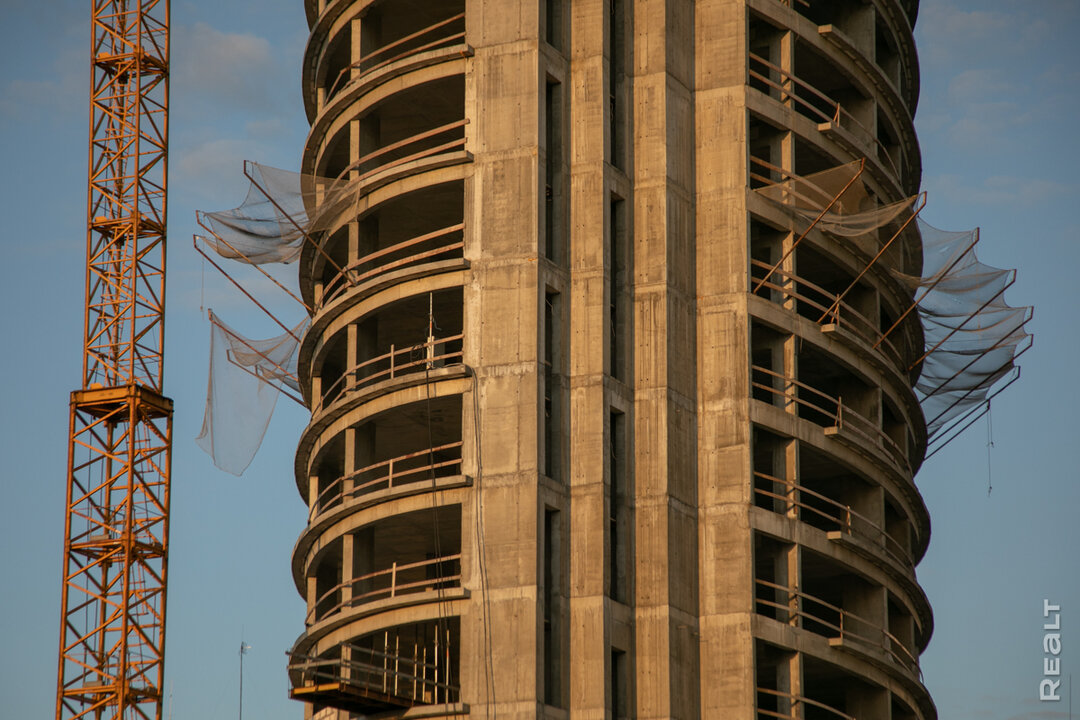 Строительство комплекса стартовало в 2019 году. В 2022-м первый дом был сдан в эксплуатацию. Многоэтажка на 314 квартир сейчас вовсю обживается и привлекает к себе внимание необычной архитектурой. Так, дом отличается не только интересной геометрической формой. На фасаде — яркие цветовые акценты элементов французских балконов. Интересно, что их цвета распределены по спектру: красный-оранжевый-желтый-зеленый-голубой-фиолетовый, что соответствует мнемонической фразе «Каждый охотник желает знать, где фазан». Уникальны и интерьеры подъездов. В основе оформления — мифология Минска, которая нашла отражение в авторских фресках в холлах первых этажей.