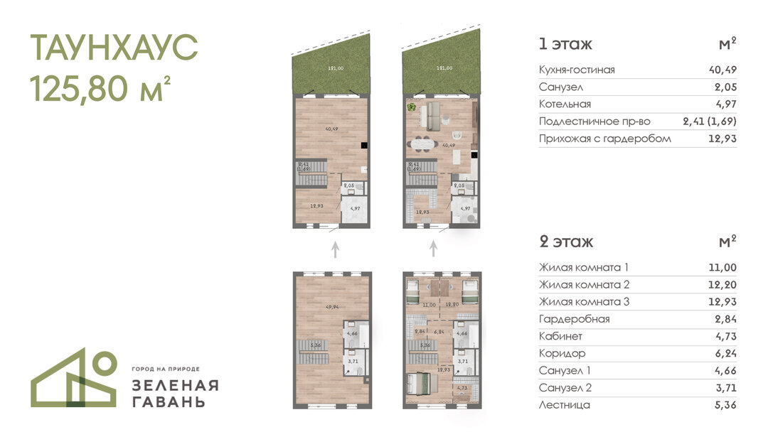 Покупателям доступны квартиры площадью 119 и 125 квадратов без внутренней отделки. На первом этаже предусмотрена светлая кухня-гостиная с панорамным витражным остеклением и выходом на участок. У входа в квартиру разместятся гардеробная, санузел и мини-котельная. На втором этаже — мастер-спальня с собственным помещением для личного гардероба и санузлом. Места хватит на еще две спальни и ванную комнату. Стоимость квадрата начинается от 1920 долларов в эквиваленте.