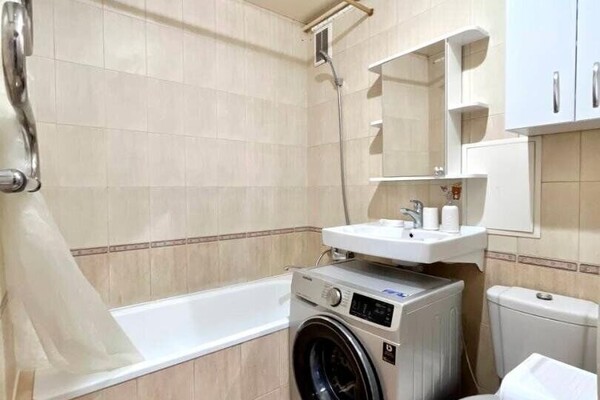 Общая площадь — 28 квадратных метров. Из них 17 — жилые. Кухня занимает 6 квадратов. В гостиной хватает места для дивана, двуспальной кровати и стеллажа. Мебель продавец готов оставить или забрать — как захочет покупатель. В совмещенном санузле подключена стиральная машина и установлена ванна.