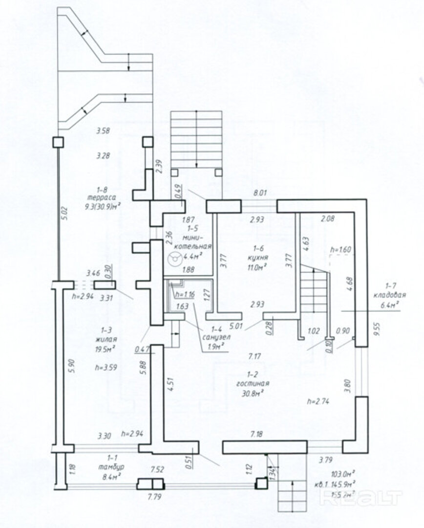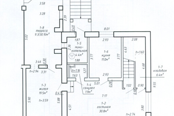 Квартира состоит из четырех жилых комнат. Судя по фотографиям и отделке, дом использовался под бизнес. Здесь — просторные комнаты, профессиональное кухонное оборудование. Исходя из планировки, на первом этаже можно обустроить столовую с выходом на террасу, гостиную, кухню и санузел. На втором этаже могут расположиться спальные комнаты и еще один санузел.