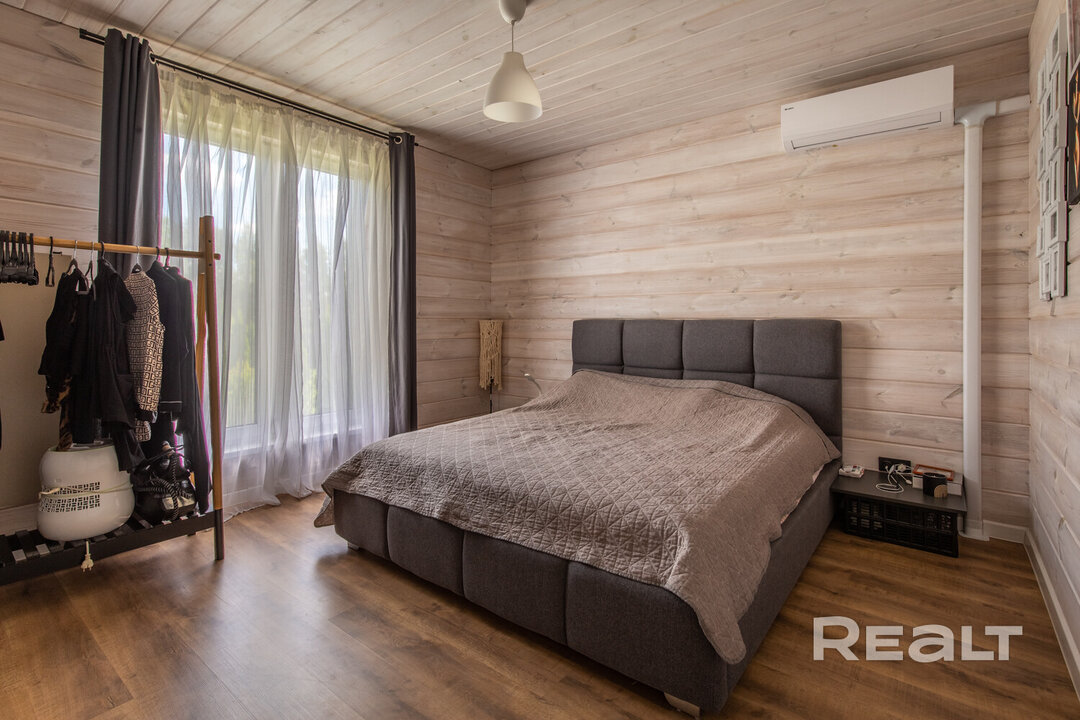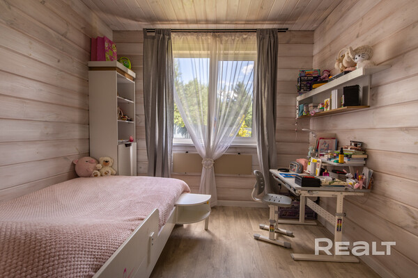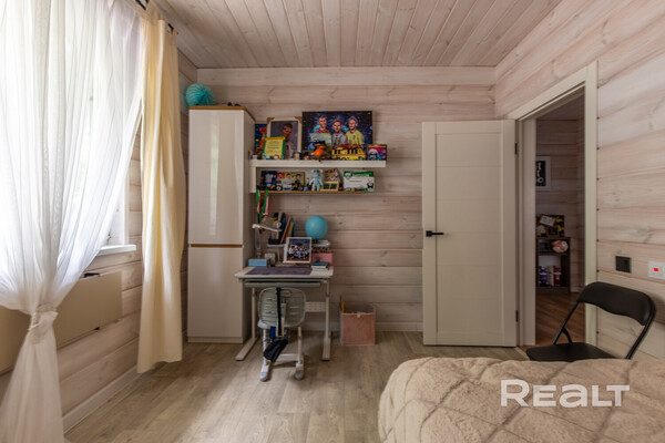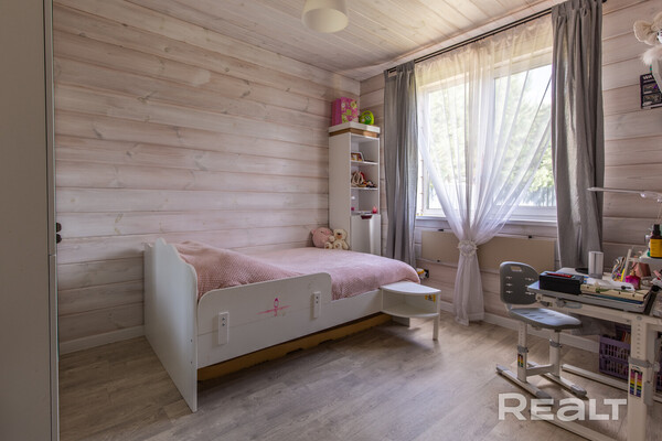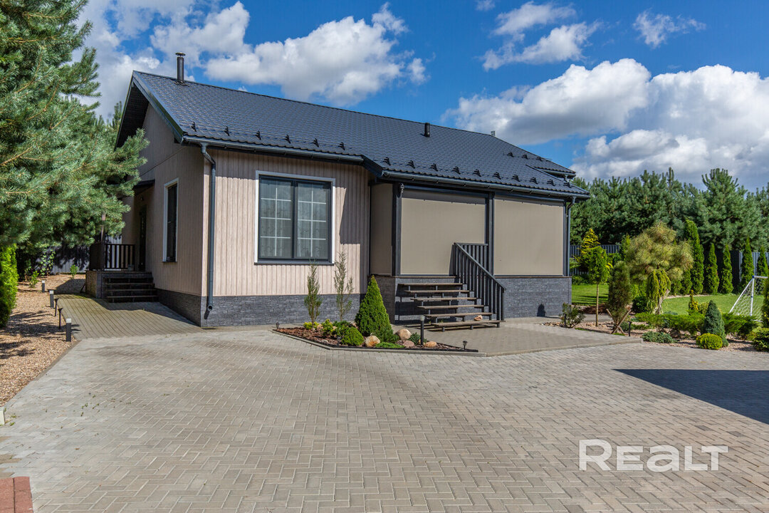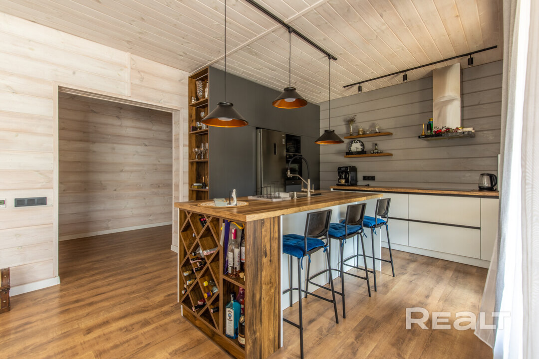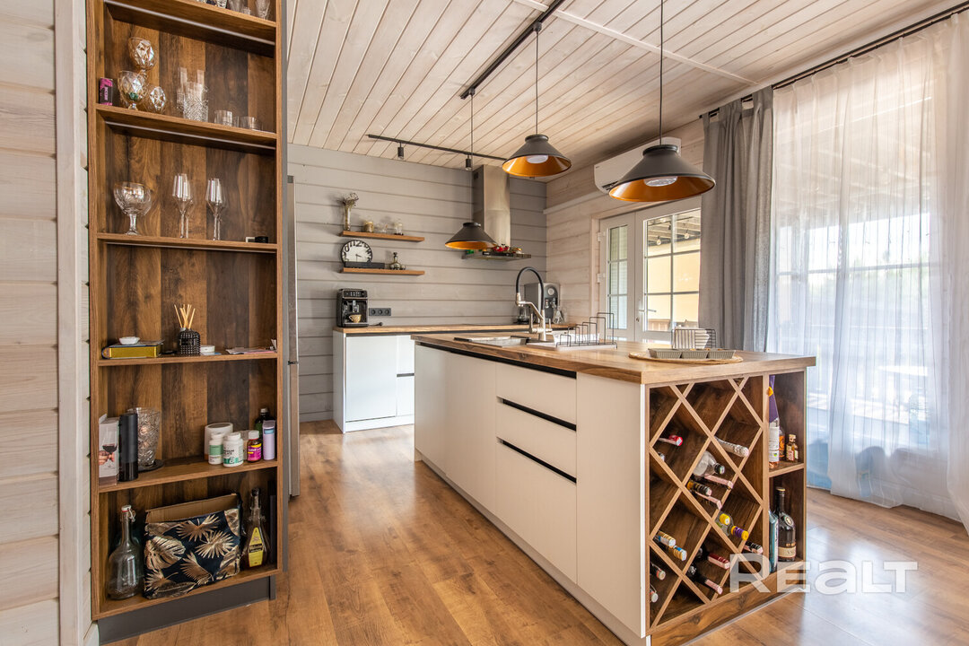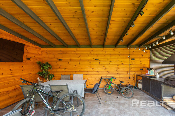 Деревня Щербины находится за Заславлем и в 23 км от Минска. Там на продажу выставлен бревенчатый дом 2022 года постройки. Его площадь — 118,5 м². Жилье возводили по скандинавской технологии. Фундамент — железобетонный, на сваях (150 см). Крышу устелили металлочерепицей. Пол, потолок и стены утеплены. Снаружи дом обшит сайдингом.