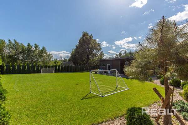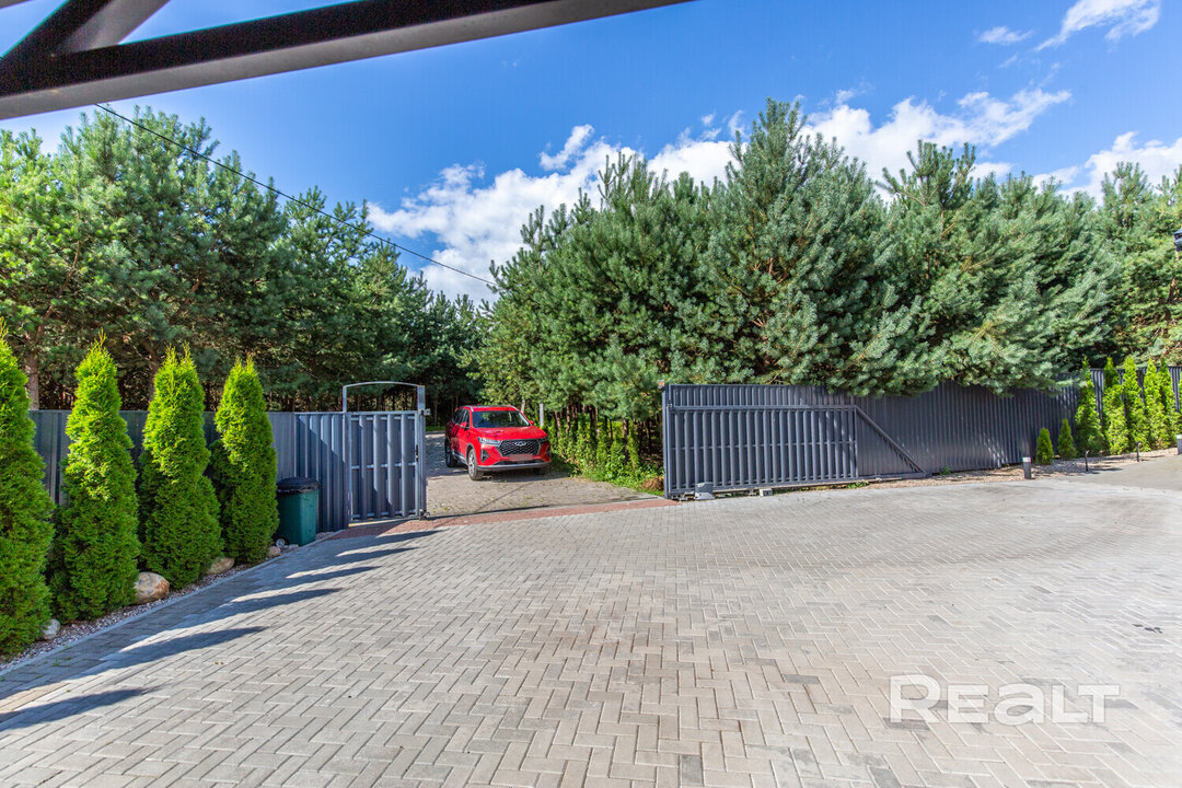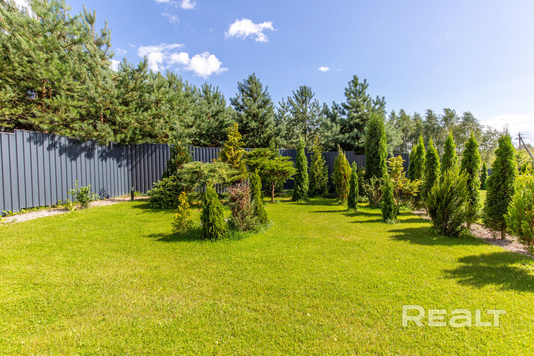 Участок занимает 13,4 сотки и окружен молодыми соснами. Территория огорожена, установлены ворота с электроприводом. По всему участку сделана дренажная система и противокротовая сетка.