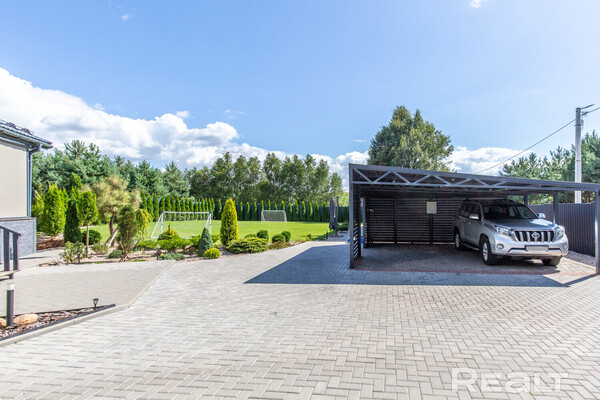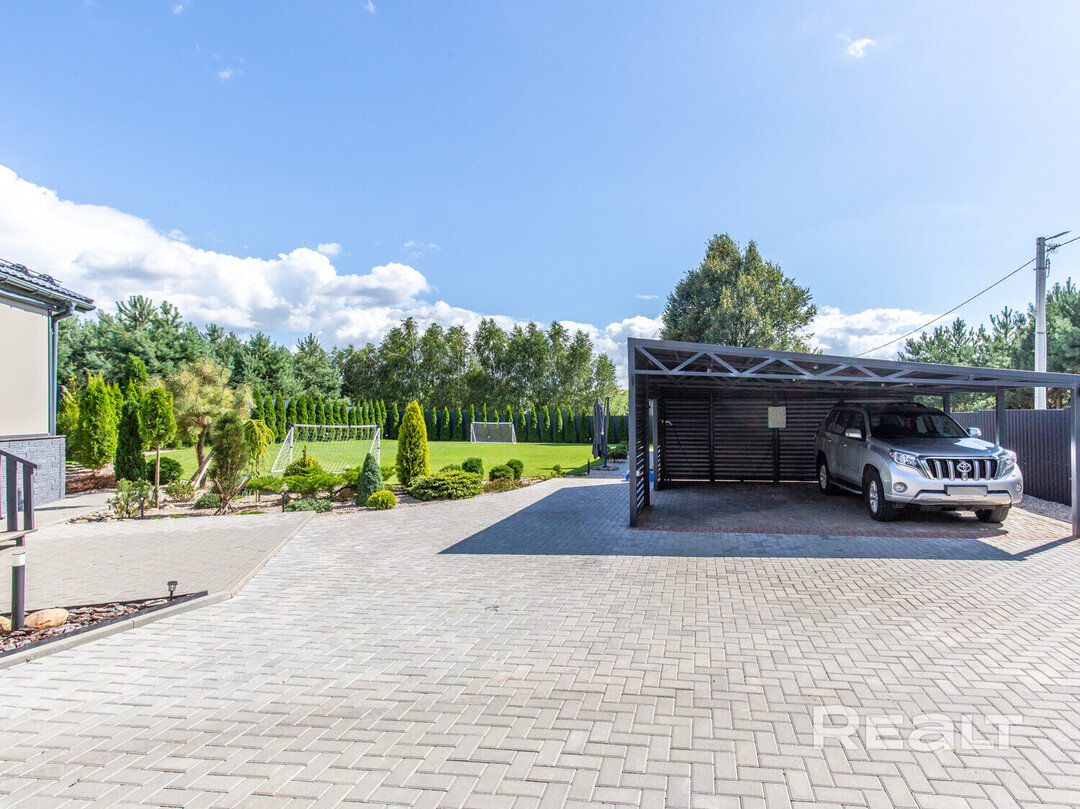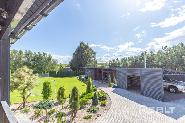 Построена летняя кухня с зоной барбекю и оборудованная проточным водонагревателем. Рядом находится хозблок, который можно переделать под баню. Тут же расположился навесной гараж на две машины с зарядкой для электромобиля.