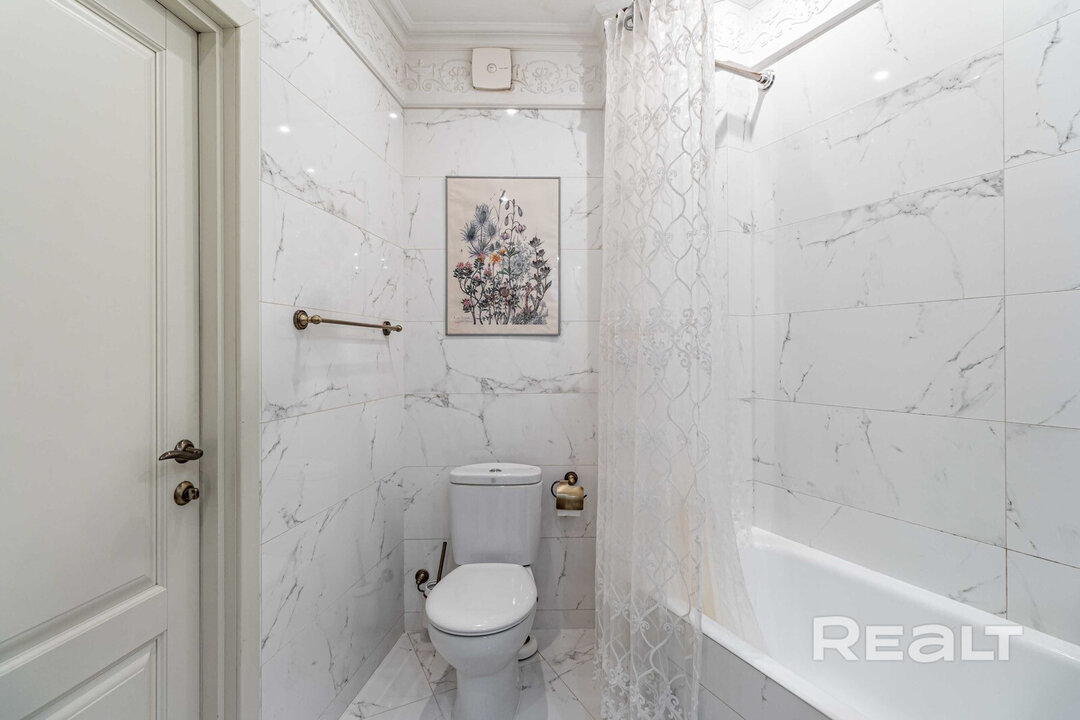 В этой квартире потолки выше — три метра. Общая площадь — 74 метра, жилая — 37, кухня — 15 метров. В квартире согласована перепланировка, а после ремонта, по словам продавца, там никто не жил. На полу уложен кварцвинил и кафель с системами обогрева. Проводка и выключатели выполнена в ретро-стиле. Есть гардеробная и множество мест для хранения. В трешке два санузла — в одном ванна с душевой, а во втором душевая.