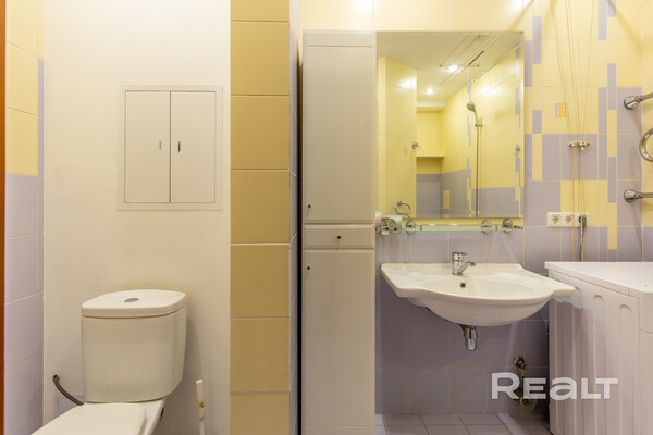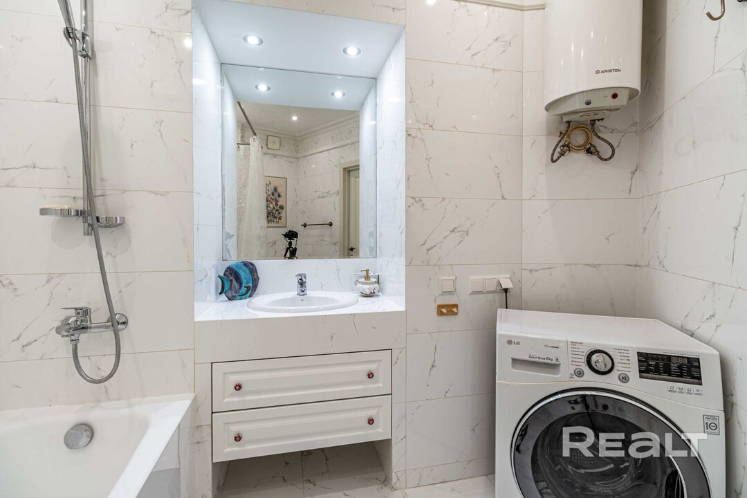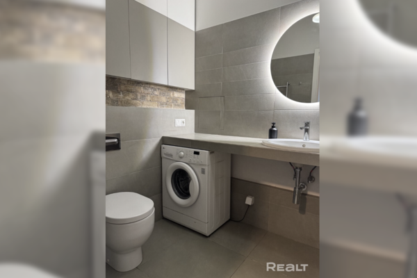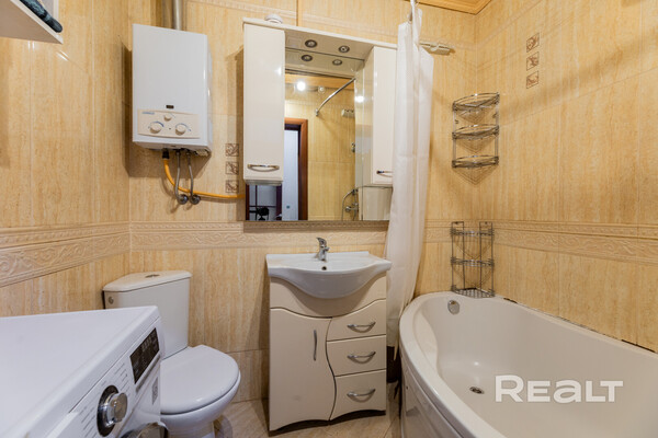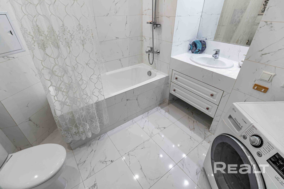 В просторной гостиной помещается два немаленьких дивана. В спальне есть шкаф-купе. В совмещенном санузле установлена ванна и стиральная машина.
