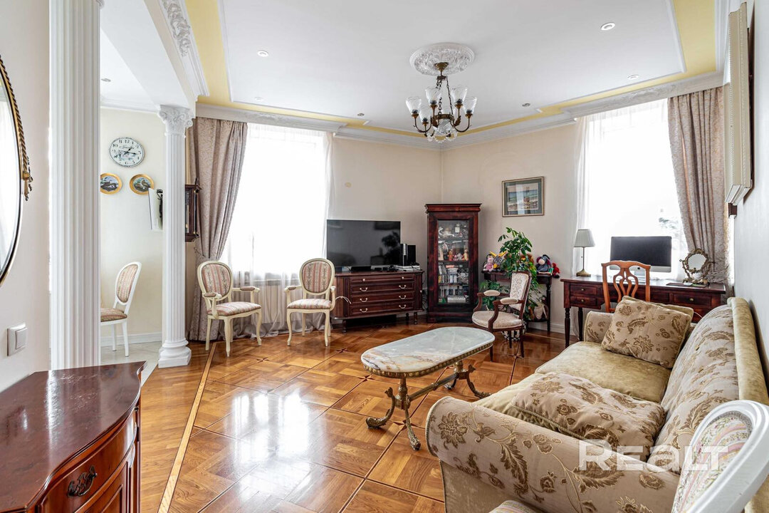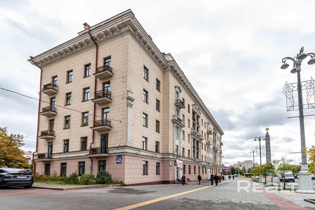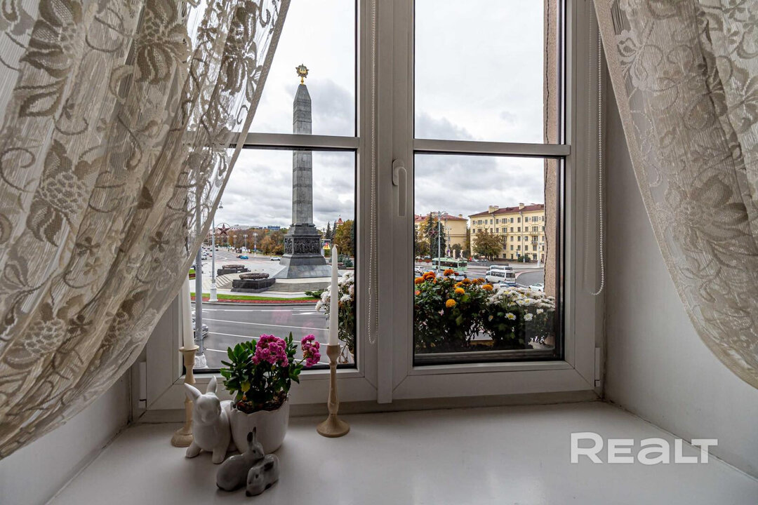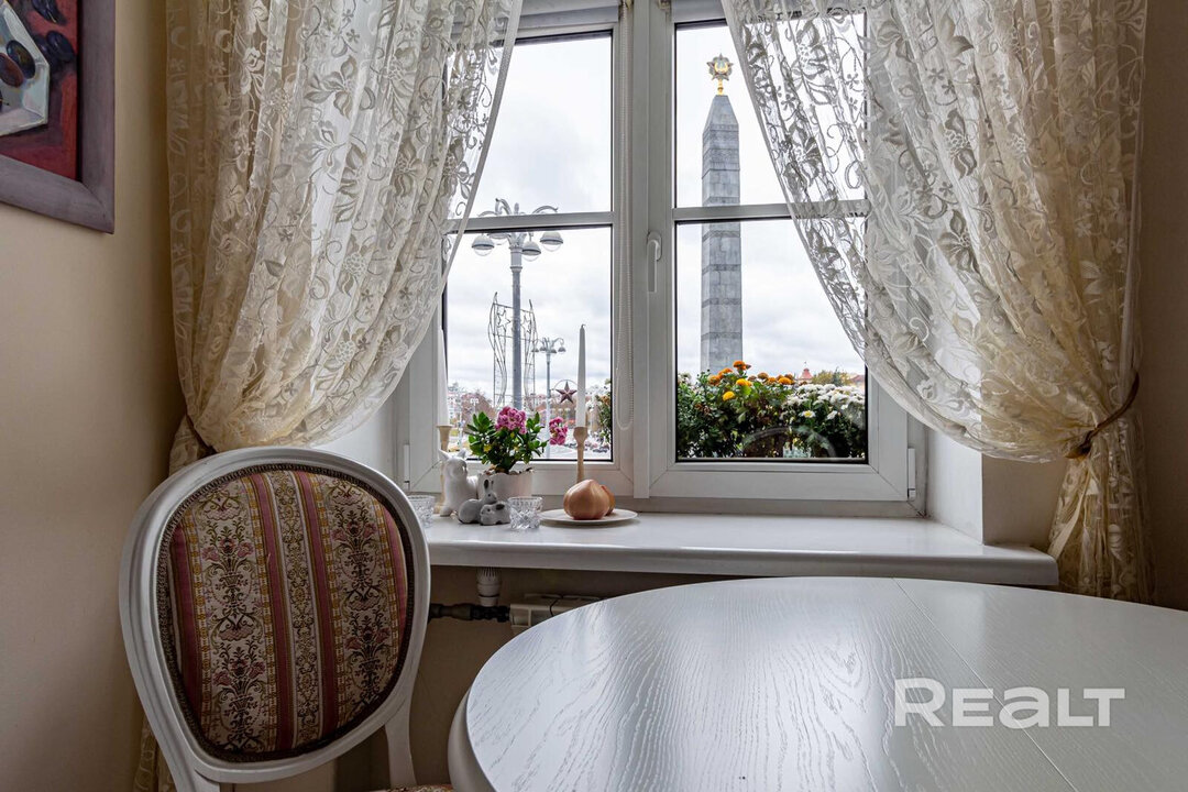 Первый вариант — двухкомнатная квартира с хорошим ремонтом в классическом стиле прямо около метро «Площадь Победы». Обелиск виден из окна. Второй этаж пятиэтажной сталинки на проспекте Независимости, 40.