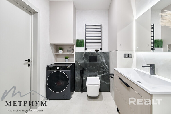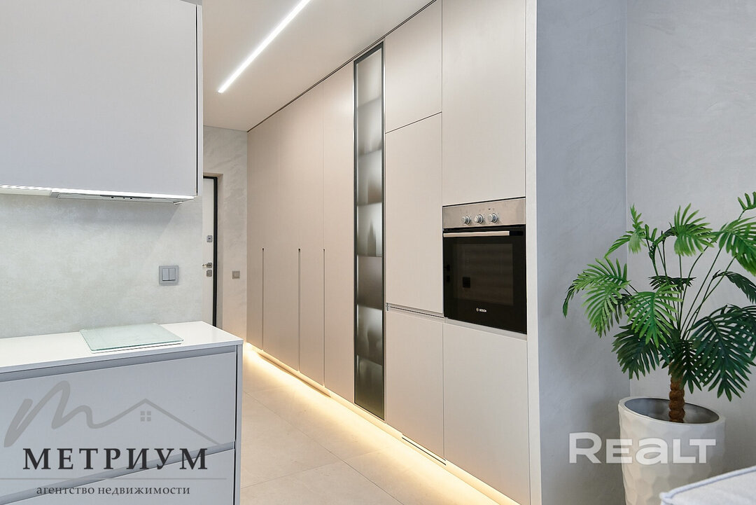 В квартире хороший ремонт — натяжные потолки с точечной подсветкой, паркетная доска на полу в комнатах, плитка — на кухне, в ванной и прихожей. Везде предусмотрен теплый пол. На кухне оборудовано рабочее место. В каждой комнате установлены кондиционеры Mitsubishi. Санузел совмещенный.