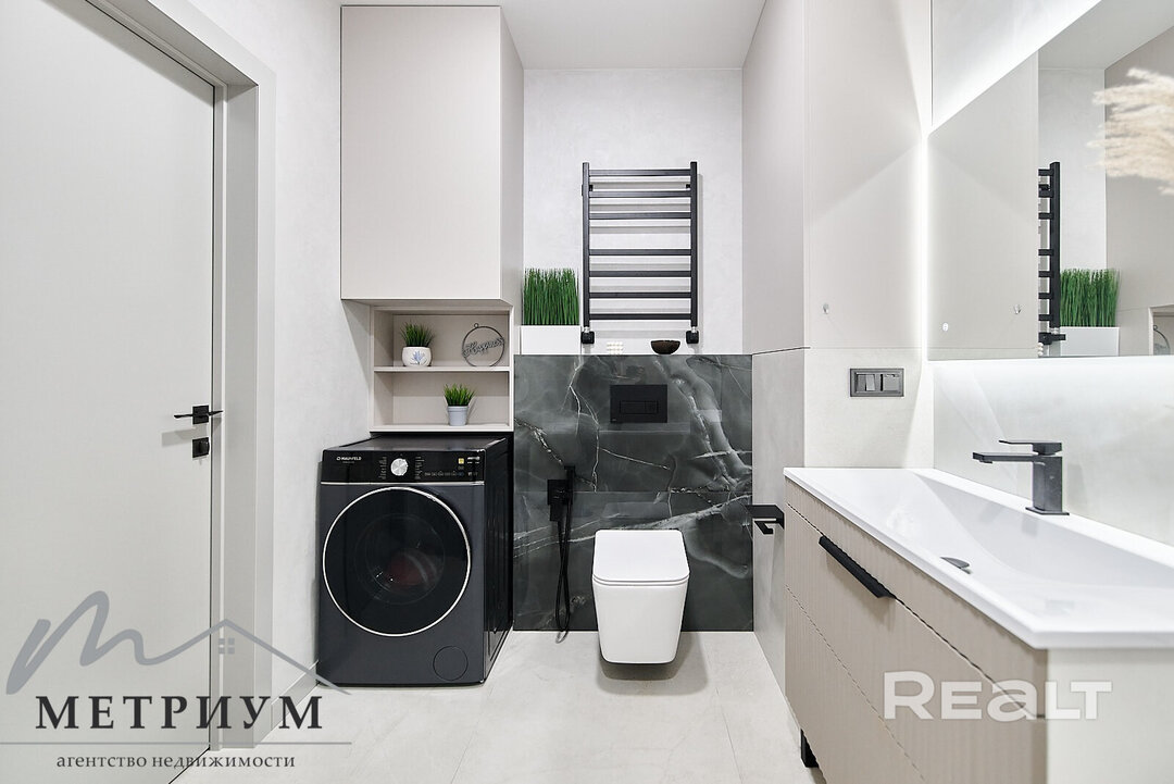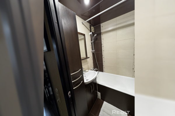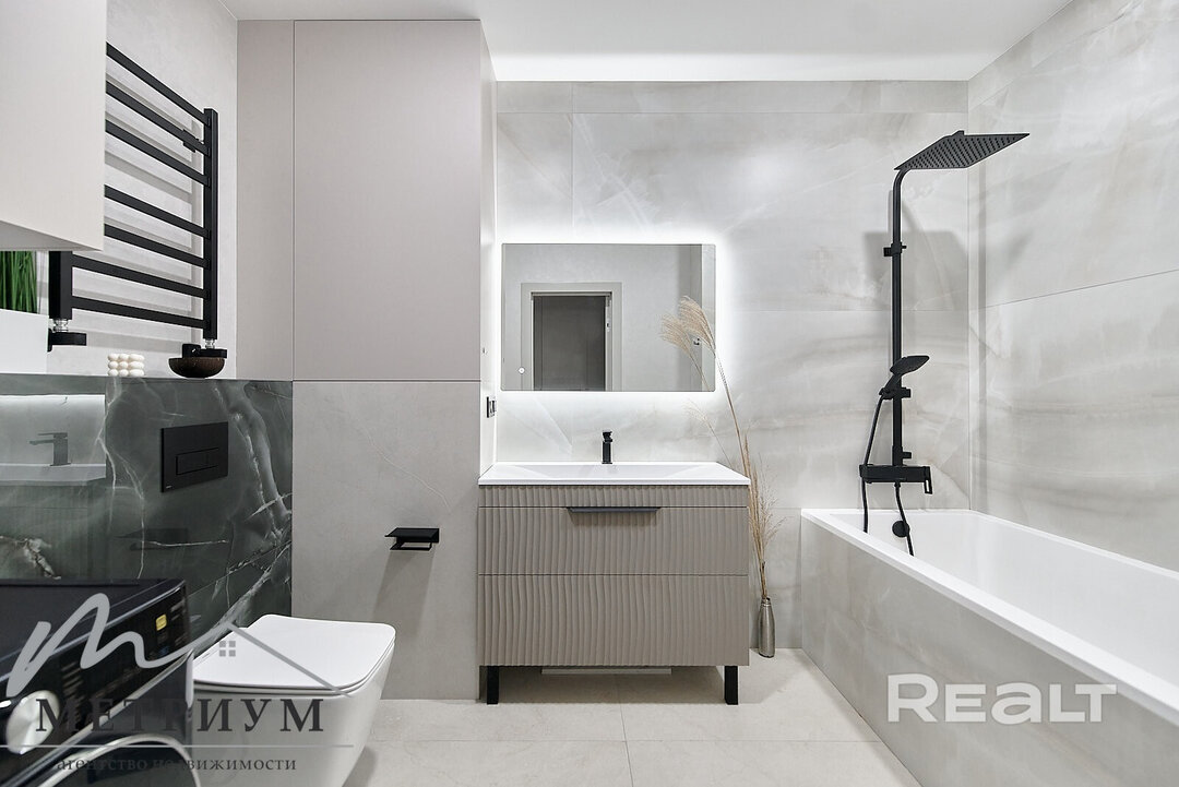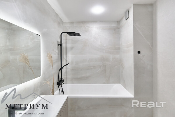В квартире современный ремонт в светлых тонах: на полу крупноформатный испанский керамогранит, на стенах итальянская декоративная штукатурка. Получилось изолировать небольшую спальню. В совмещенном санузле установлена ванна. Есть лоджия.