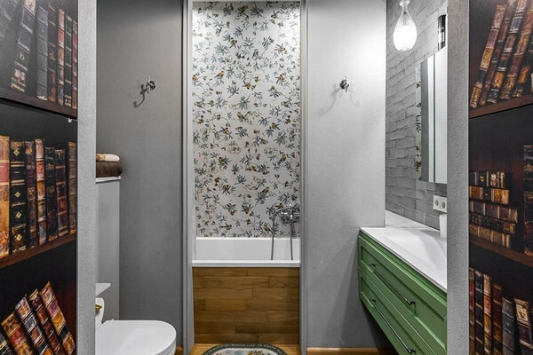 В одной жилой комнате оборудована гостиная, а во второй спальня. Есть помещение, которое можно использовать как гардеробную или кладовую. Санузел раздельный. Установлена ванна. Всю мебель и технику хозяева оставляют покупателям.