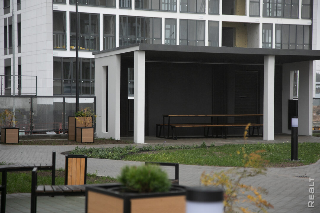 На этом обзор мест общего пользования не заканчивается. Дома, стоящие на стилобатах, состоят из двух секций, в каждой из них сделан отдельный лифт. А между секциями — закрытые дворики без машин, со скамейками, озеленением, детскими площадками и рекреационными зонами под навесом. Получаются пространства, где всем найдется место: а еще сюда можно будет спокойно отпустить ребенка, ведь приглядеть за ним удастся прямо из окна.