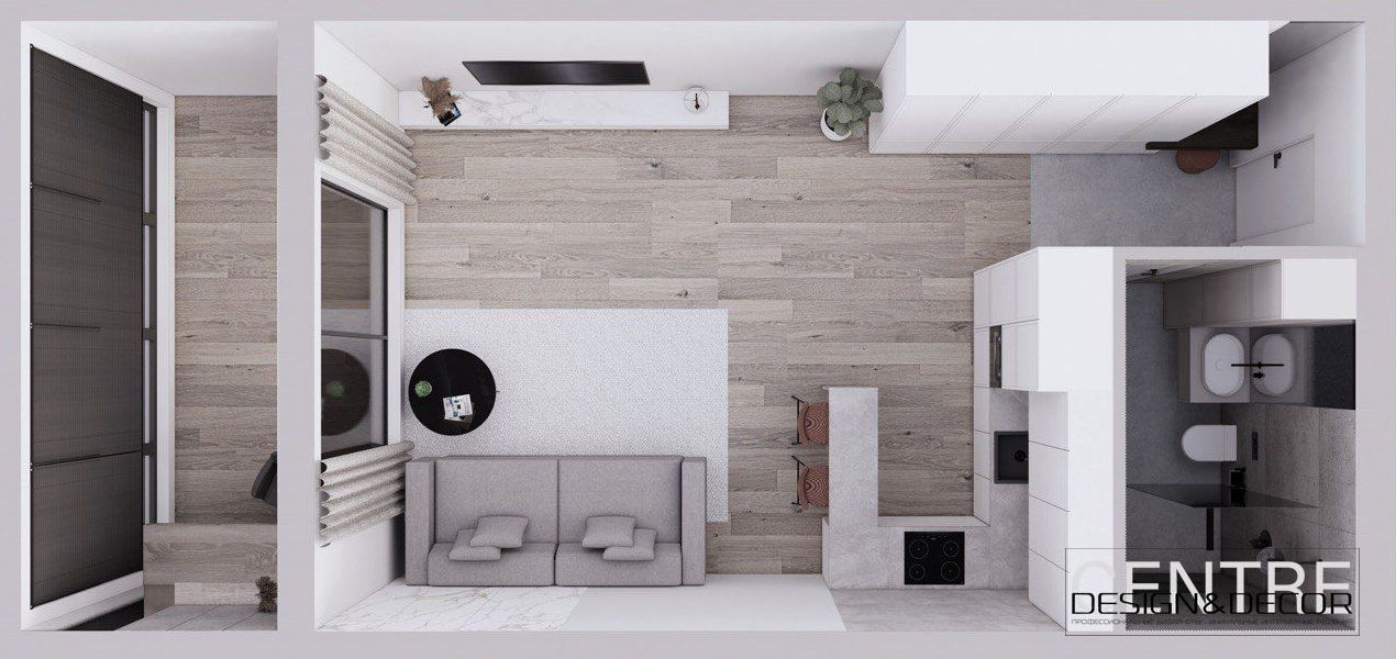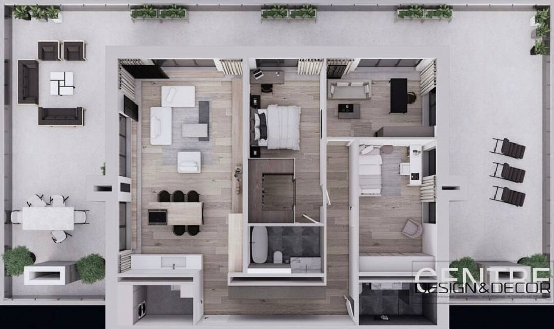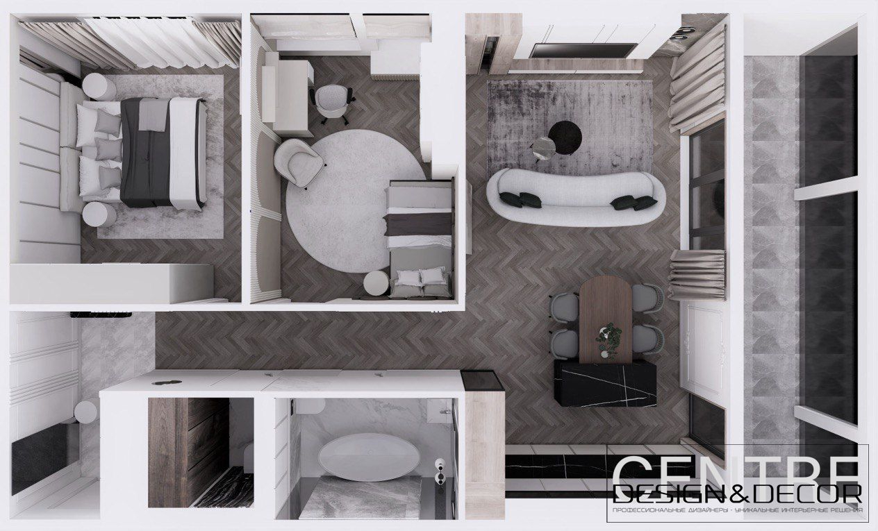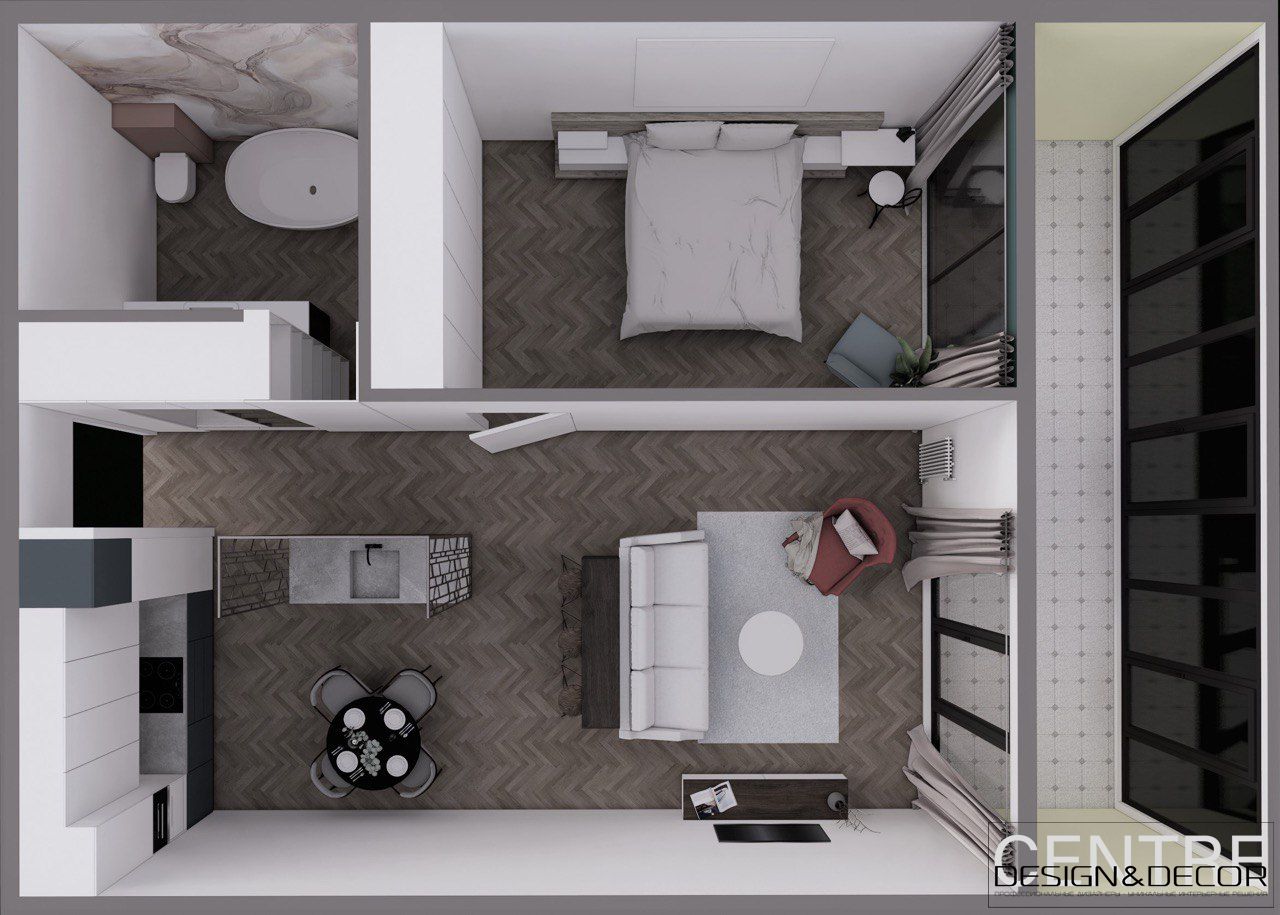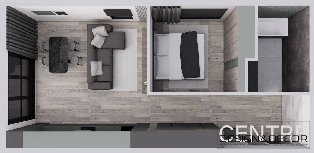 Застройщик поделился дизайн-проектами, на которых видно, как можно зонировать площади и расставить мебель. Так, например, может выглядеть однокомнатная квартира: