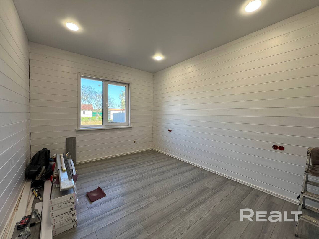 Компактный дом состоит из кухни-гостиной, спальни, санузла и террасы. Внутри уже выполнена качественная внутренняя отделка. Полы — ламинат, натяжные потолки. Стены обшиты вагонкой и окрашены. Мебель, техника и предметы интерьера на даче отсутствуют. Обставлять дом по своему вкусу будут уже новые жильцы.