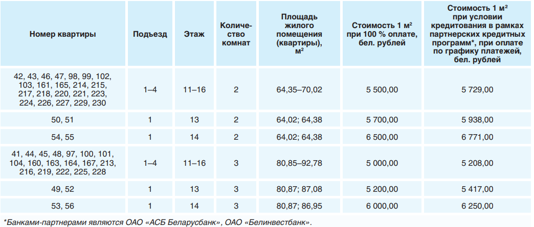 — 26 двухкомнатных квартир площадью 64−70 квадратных метров по стоимости 5500−6500 рублей за квадрат (1880−2220 долларов);