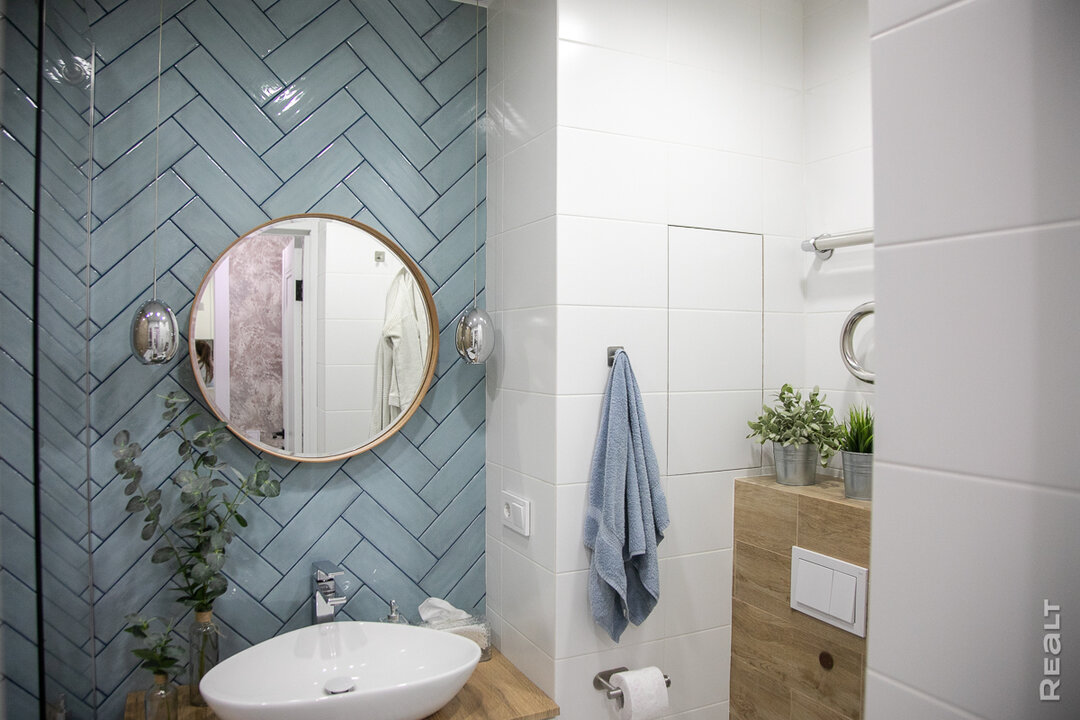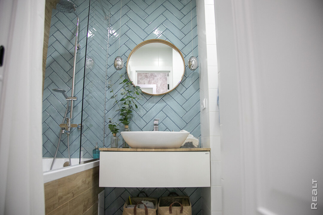 Голубая плитка идеально сочетается с цветом древесины. На полочках стоят гели, скрабы, поблизости висят крючки с полотенцами — всё сделано с удобством. Приглушенный свет подвесных светильников создает другое настроение.