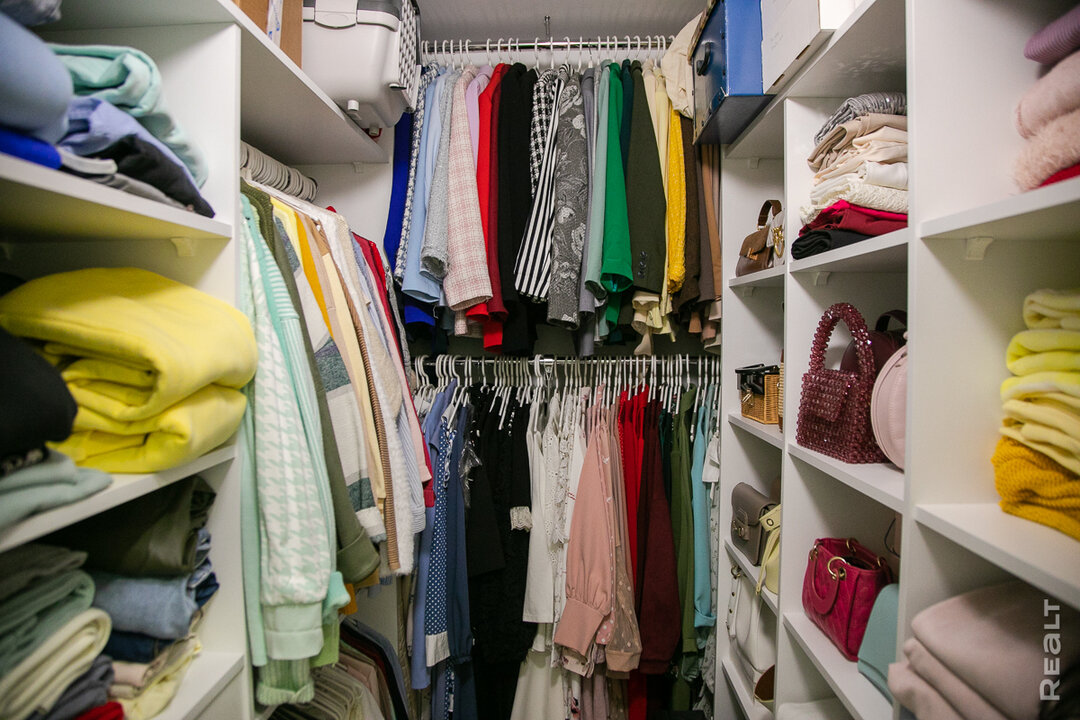 — Захожу сюда и чувствую себя героиней сериала, Кэрри Брэдшоу, — показывает полки с яркими нарядами и цветными сумками женщина. — Вообще, гардеробная — это та еще математика. Размер полок должен вмещать два ряда одежды, лучше установить штанги и для платьев, и для костюмов, рубашек. Всем бы советовала делать полки закрытыми, чтобы меньше пыли попадало.
