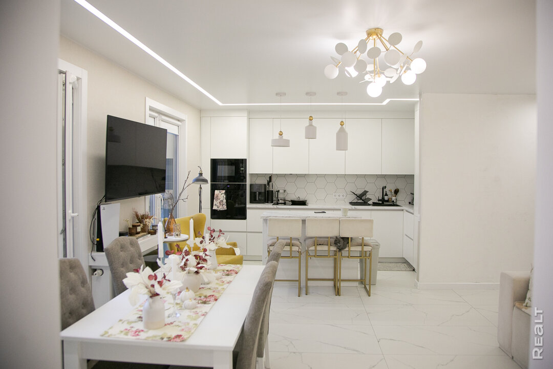 В этой квартире реализована мечта многих — эдакой границе между кухней и гостиной служит остров. За ним семья и готовит, и ест, а со стороны кухни есть ящики, где стоит крупная техника.