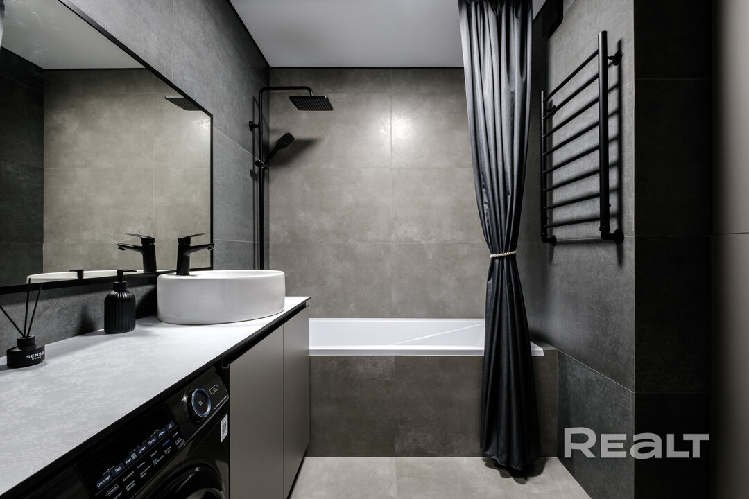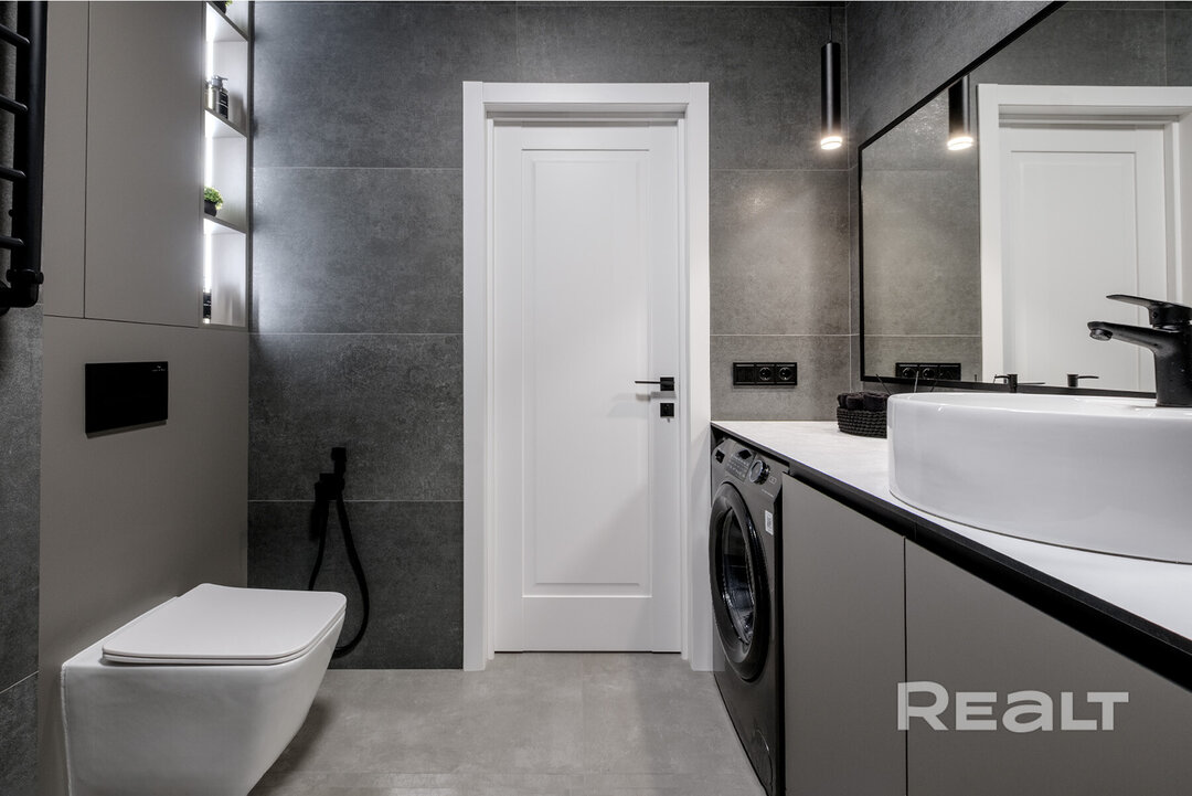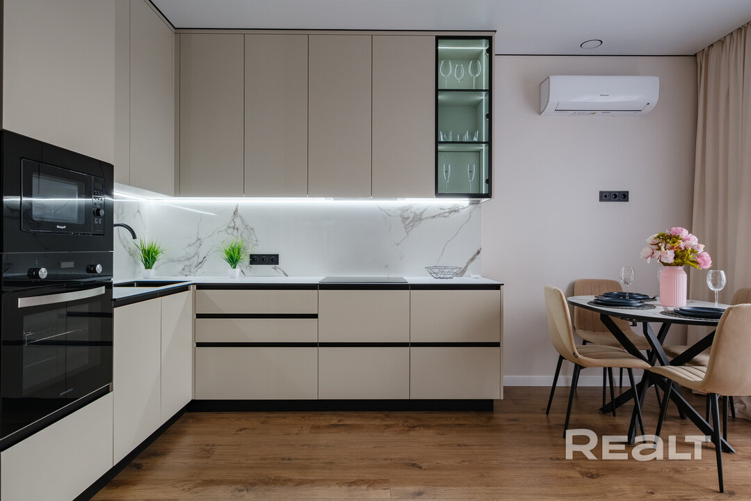Кухня и гостиная тут совмещены. Установлен гарнитур со столешницей из компакт плиты, имеется духовой шкаф, варочная панель, посудомоечная машина, встроенный холодильник с морозильной камерой, вытяжка и встроенная СВЧ-печь. Потолки натяжные, на полу лежат ламинат и плитка. В квартире работают два инверторных кондиционера.