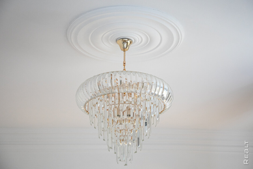 Самая долгая работа в квартире была связана с выравниванием потолков. Из-за слоев шпаклевки он потерял примерно 15 сантиметров, но результат того стоил. Сейчас его украшают новые розетки и плинтуса по периметру, что создают эффект лепнины.