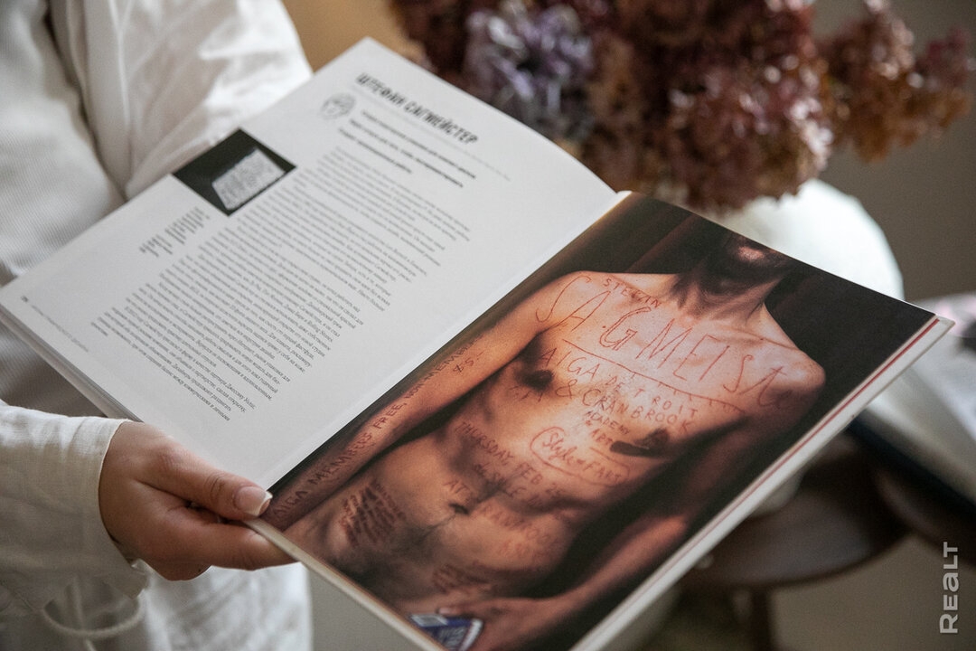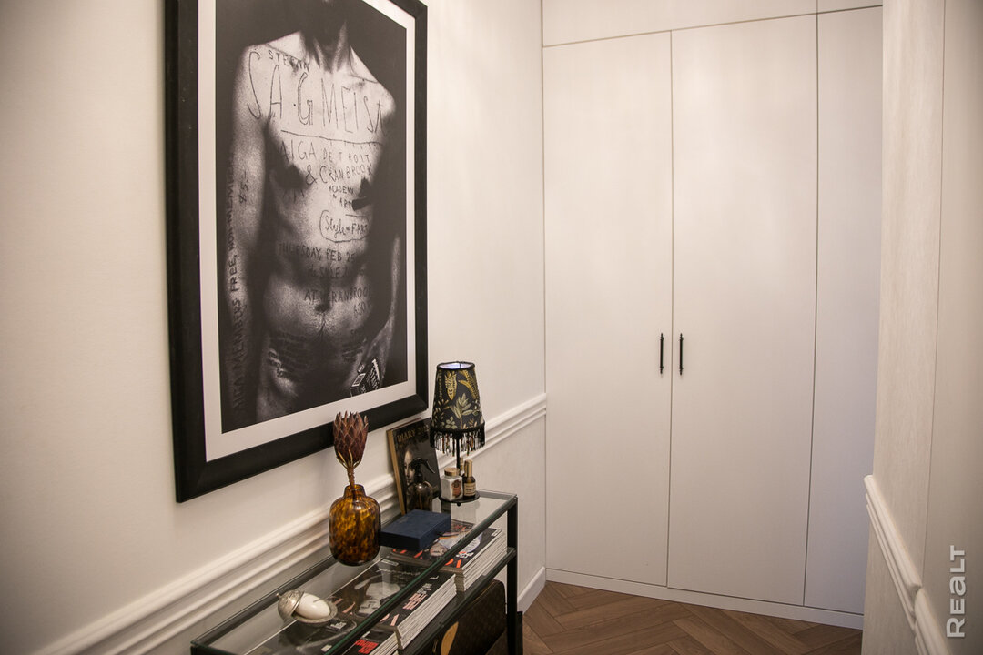 — Светильники над кухонным гарнитуром я нашла у бабушки на чердаке. Главная картина этой зоны — барельеф с античной тематикой. Его мне делала на заказ семья художников из Беларуси. Еще одна знаковая работа, вокруг которой начала строить интерьер квартиры, — афиша выставки иконы графического дизайна Штефана Сагмистера. Она — отдельное произведение искусств. На афише мы видим тело Штефана, на котором выцарапана вся информация о мероприятии. Это не фотошоп, а реальное фото. Я увидела в этом такой посыл: человек ради своего дела должен идти на какие-то жертвы. Успех дается нелегко. Фото попалось мне на четвертой паре. Тогда я поняла, что оно обязательно когда-нибудь будет висеть у меня в квартире.