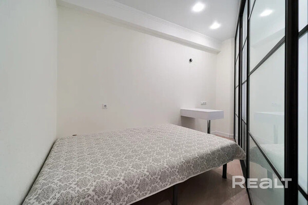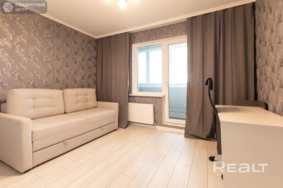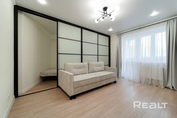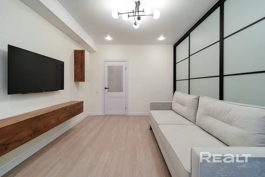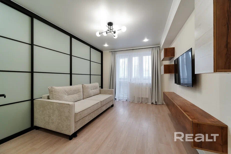 Следующий вариант — квартира на восьмом этаже 10-этажного дома, построенного в 2020 году по адресу Дроздовича, 6. По техпаспорту это все же однушка, но благодаря перегородке между гостиной и спальней ее превратили в двушку. Такие изменения не надо оформлять юридически.