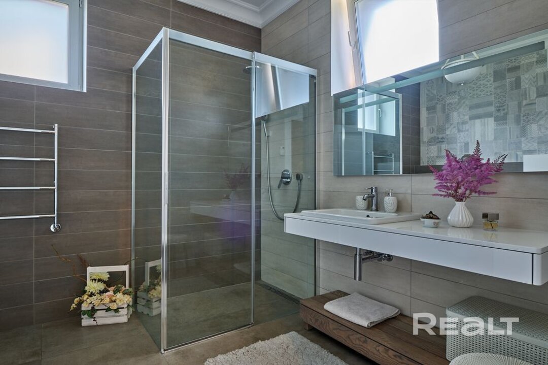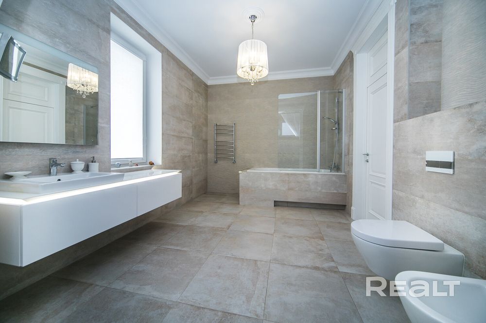 Внутренняя отделка выполнена из качественных материалов: испанская плитка с подогревом, паркетная доска BOEN, сантехника Villeroy & Boch. Обрщают на себя внимание дверные проемы нестандартной высоты с окнами над ними. Интерьер обставлен новой мебелью. Как вы можете видеть, современная классика сильно отличается от тяжеловесной и позолоченной «дворцовой», которую мы привыкли видеть в коттеджах из 90-х. Здесь интерьер светлый, тёплый и гармоничный, создает ощущение уюта и пространства.