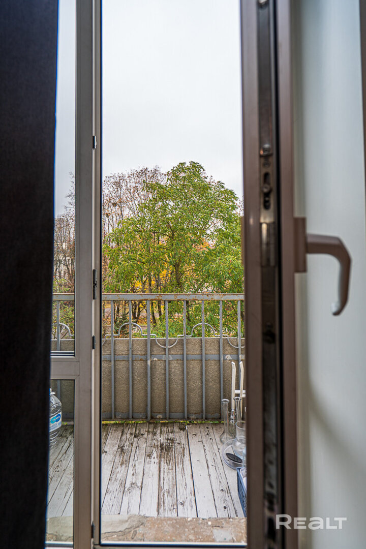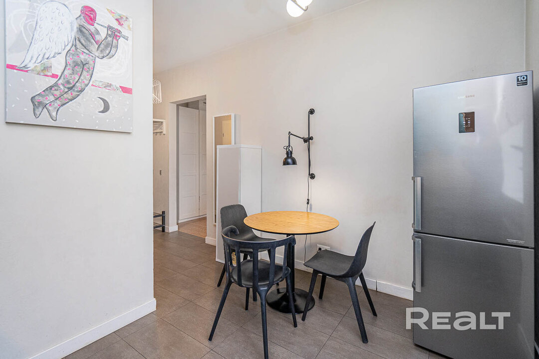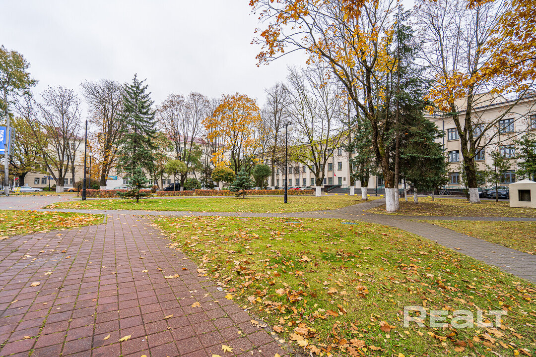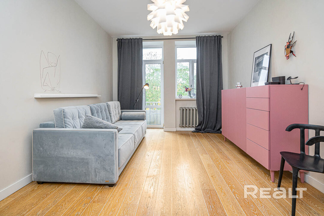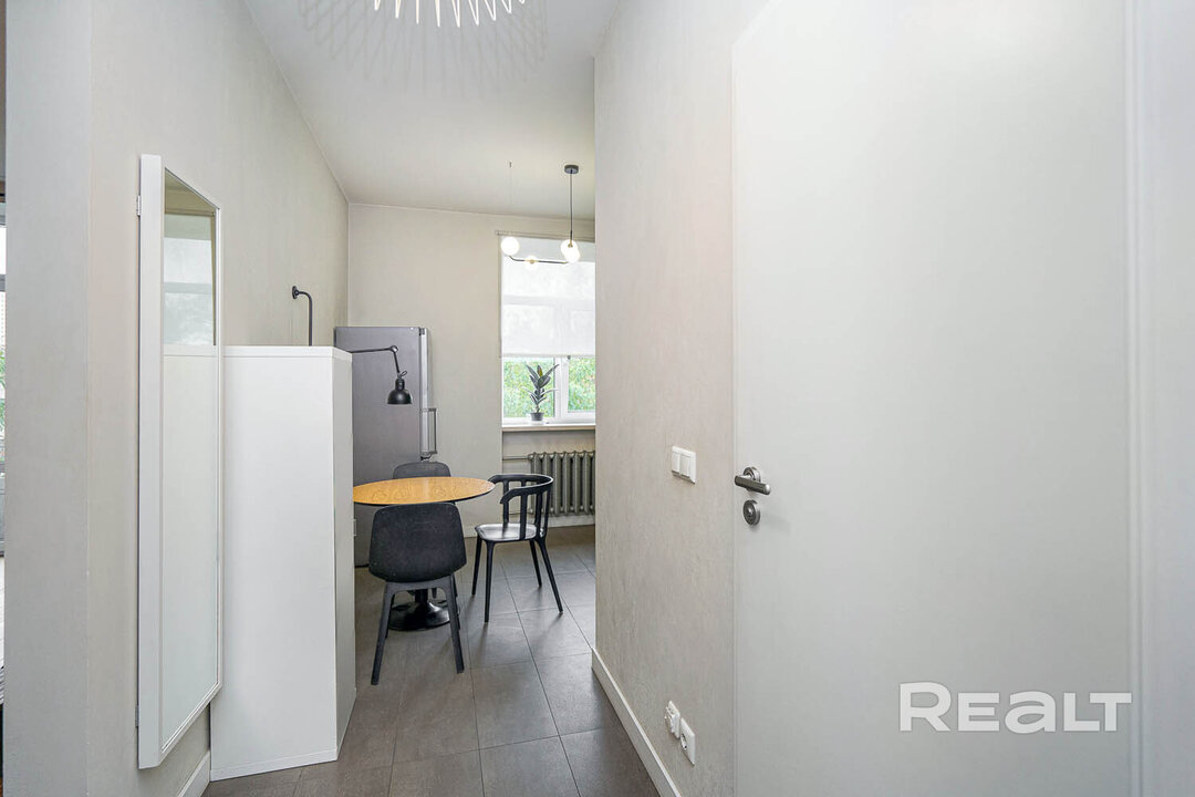 Дом на проспекте Независимости, 100 построили в четыре этажа в 1961 году. На последнем уровне сейчас продается квартира в 39 м² — однокомнатная сталинка с высокими потолками в 2,95 м и кирпичными стенами.