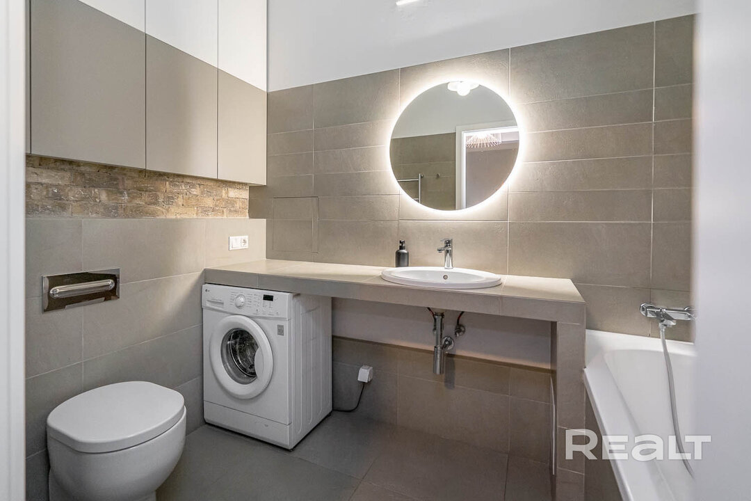Санузел изначально был раздельный, но пространства решили объединить. Тут стоит стиральная машина, установлена итальянская сантехника.
