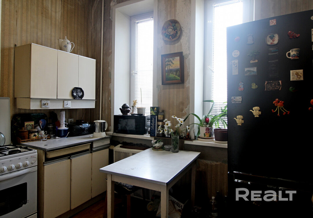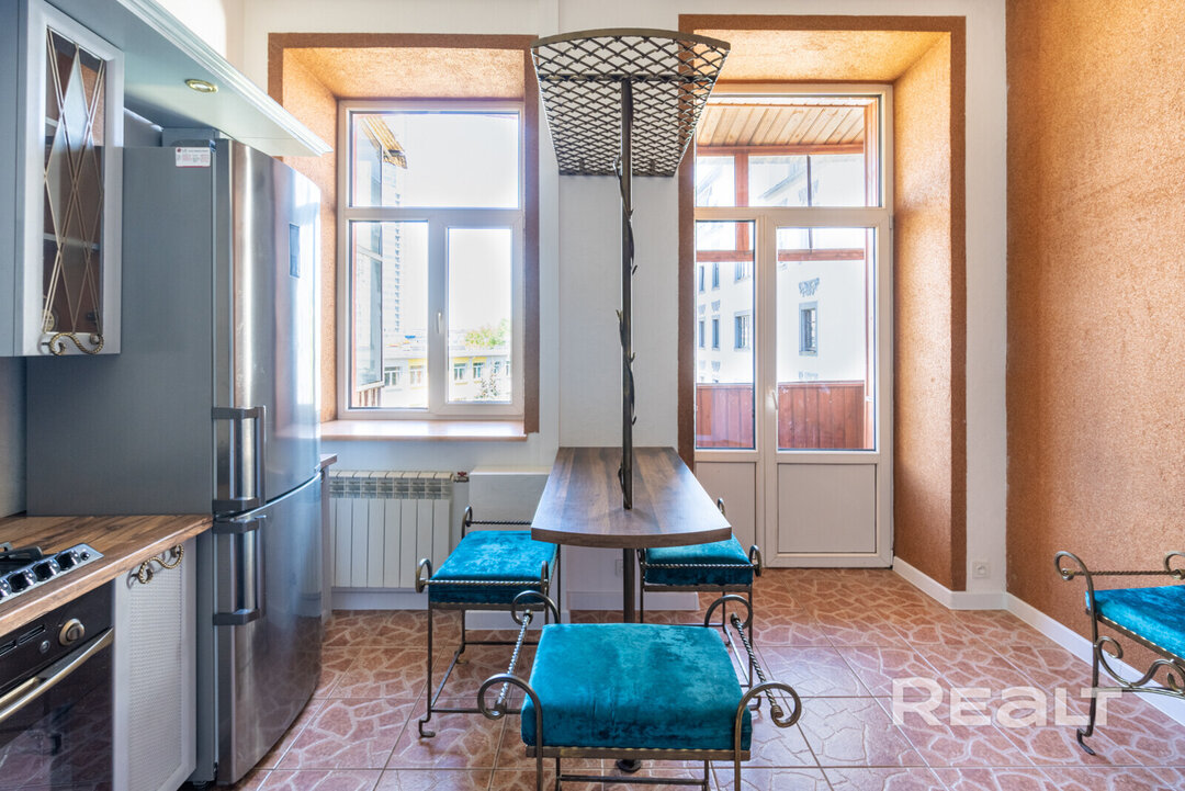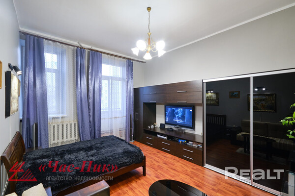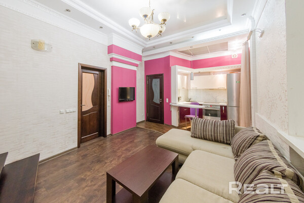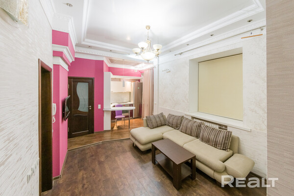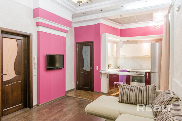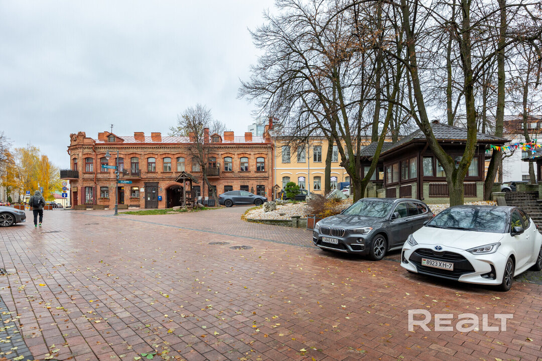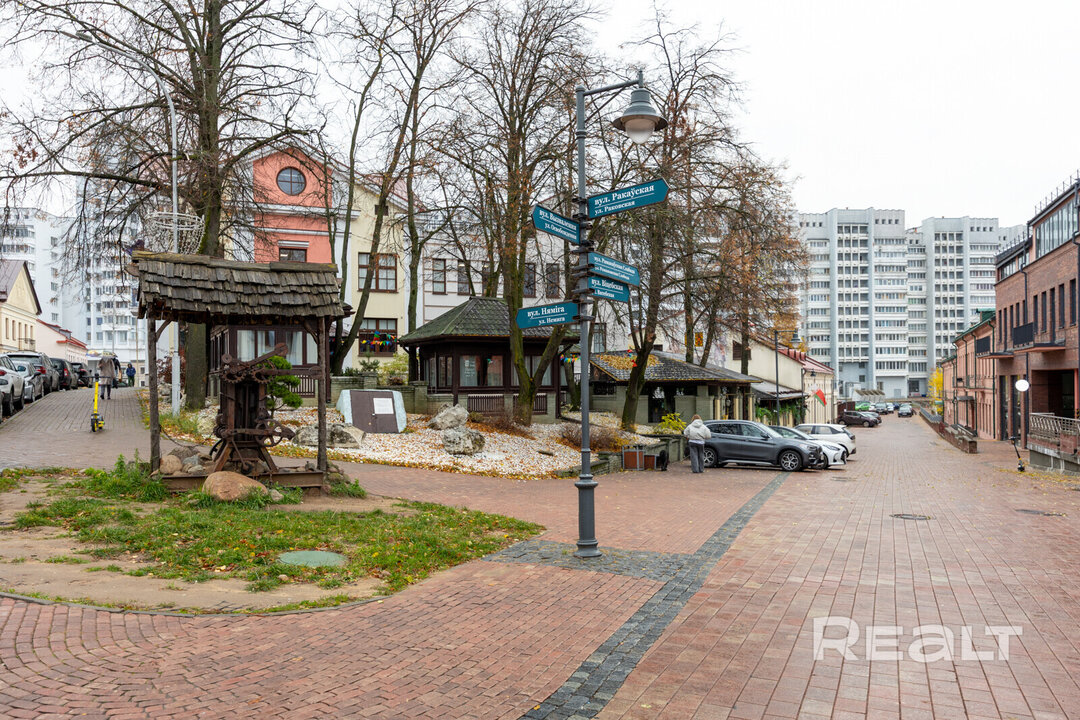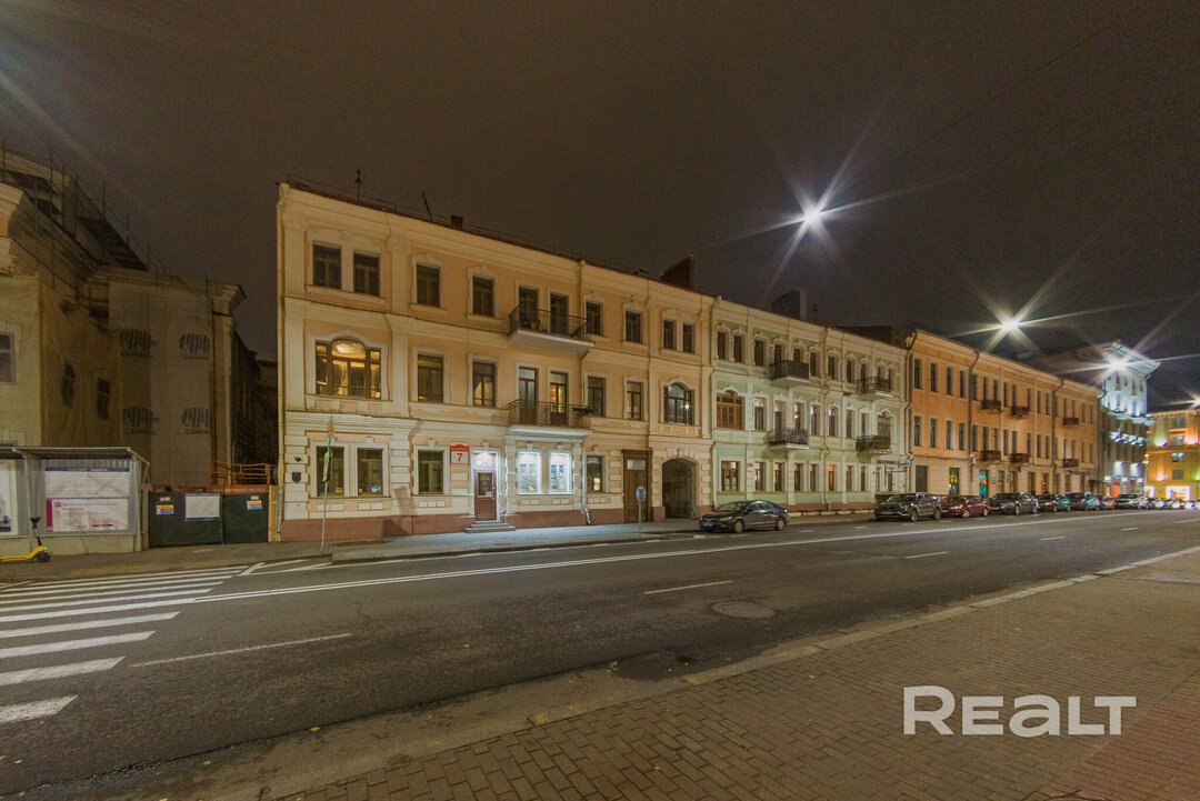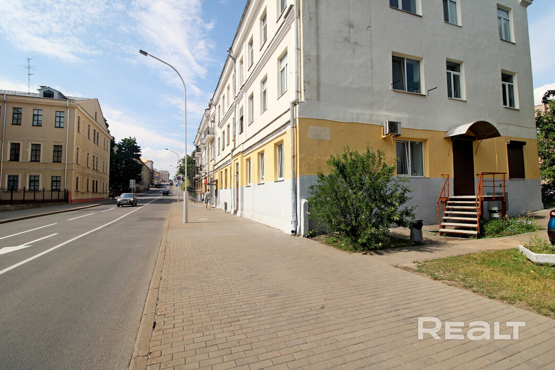 Дом отличают высокие потолки — 3,15 метра. Окна выходят на тихий зеленый благоустроенный двор. Подчеркивается, что при капитальном ремонте дома произведена замена коммуникаций. Про окружение и говорить не приходится: рядом можно найти множество магазинов, торговых центров, ресторанов, кафе и многого другого. Неподалеку находится железнодорожный вокзал, станции метро «Первомайская» и «Купаловская», набережная реки Свислочь с велодорожкой и местами для отдыха. Продают квартиру за 89 тысяч долларов (2993 доллара — за метр).